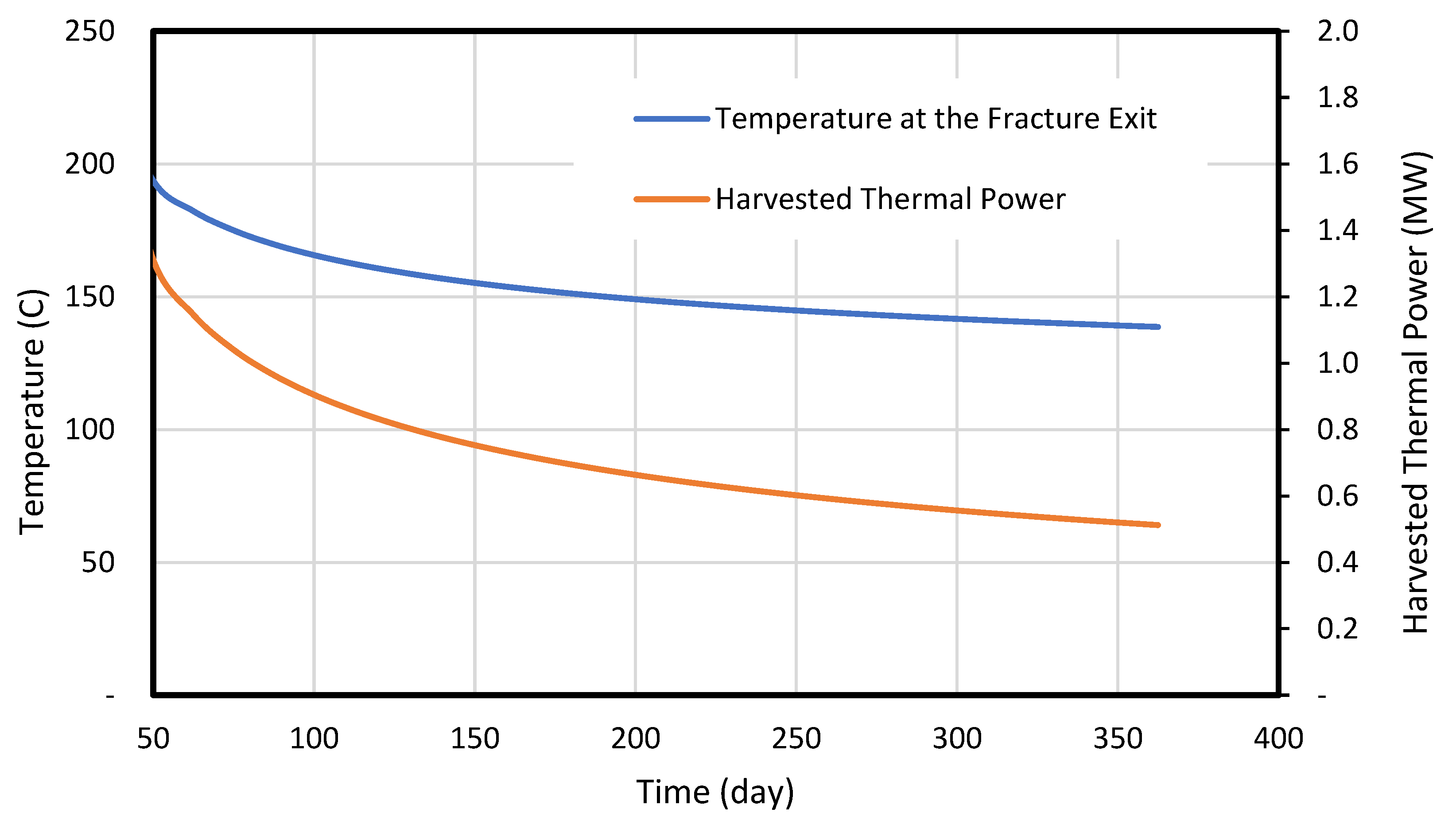 - As a result of the continuous heat transfer from the rock matrix to the injected work fluid, over time, both the temperature and thermal power of the produced fluid drop significantly. If the flowing work fluid is in constant contact with the formation rock without allowing for heat regeneration, the temperature of the produced fluid will be greater than 125 °C in the first three years, which is much higher than the 75 °C required for electricity generation with ORC technology.