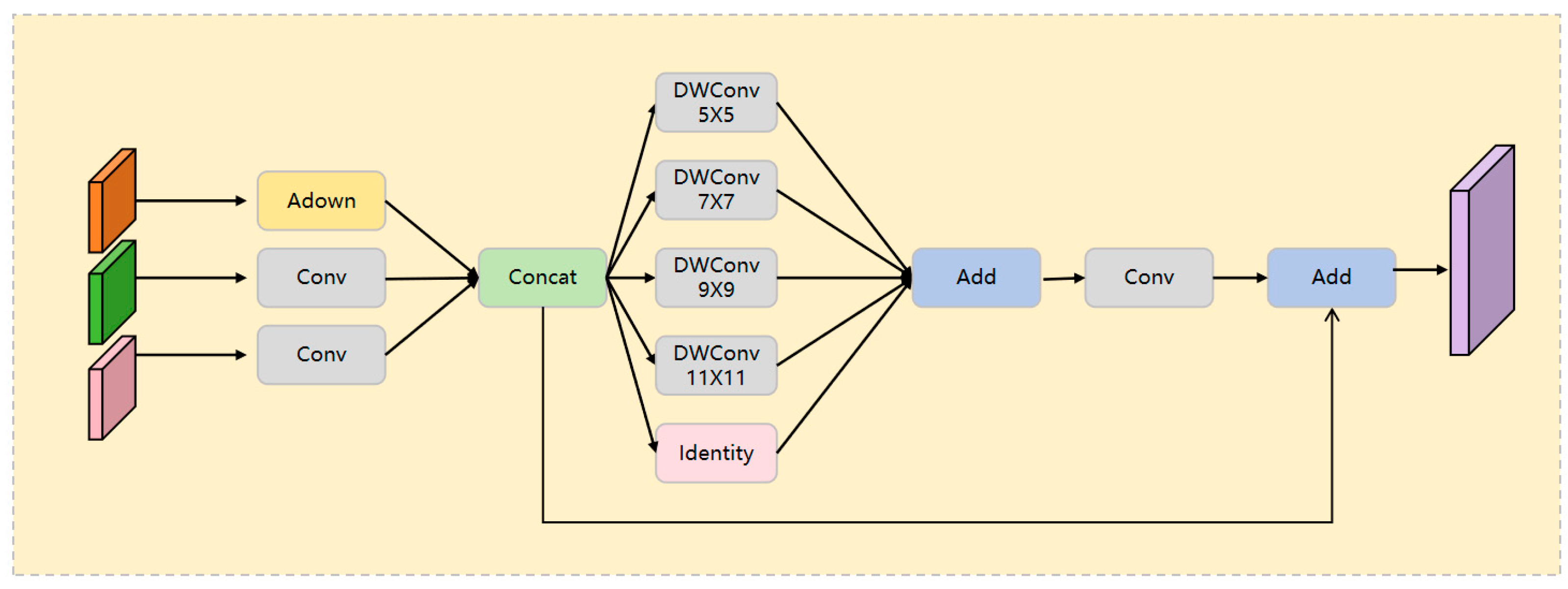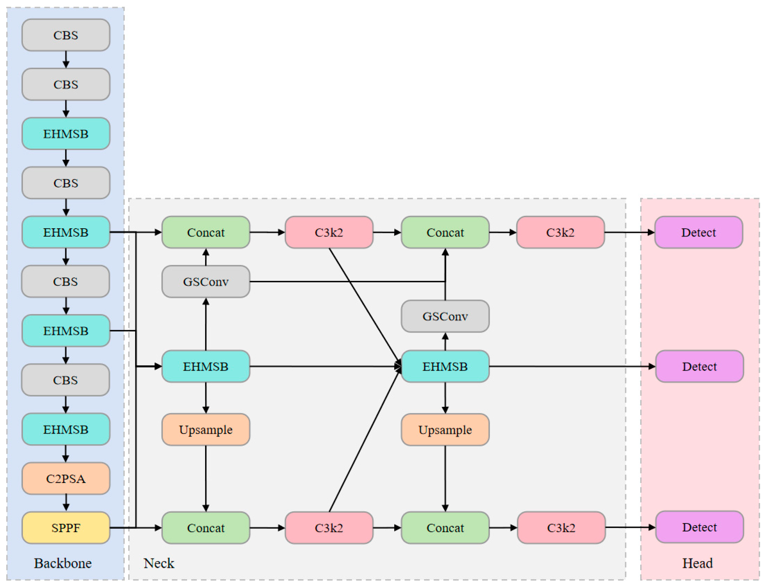 The experimental results show that replacing the C3K2 modules in the backbone of YOLO11n with the EHMSB module led to an increase of 1.5% in both mAP@0.5 and mAP@0.5:0.95. Further, replacing the original feature pyramid network (FPN) in YOLO11n with the newly designed dual-ESMSAB-enhanced FPN resulted in improvements of 2.6% and 3.1% in mAP@0.5 and mAP@0.5:0.95, respectively. Finally, integrating both the EHMSB and the new FPN into YOLO11n yielded further performance gains, with mAP@0.5 and mAP@0.5:0.95 increasing by 2.9% and 4.4%, respectively.