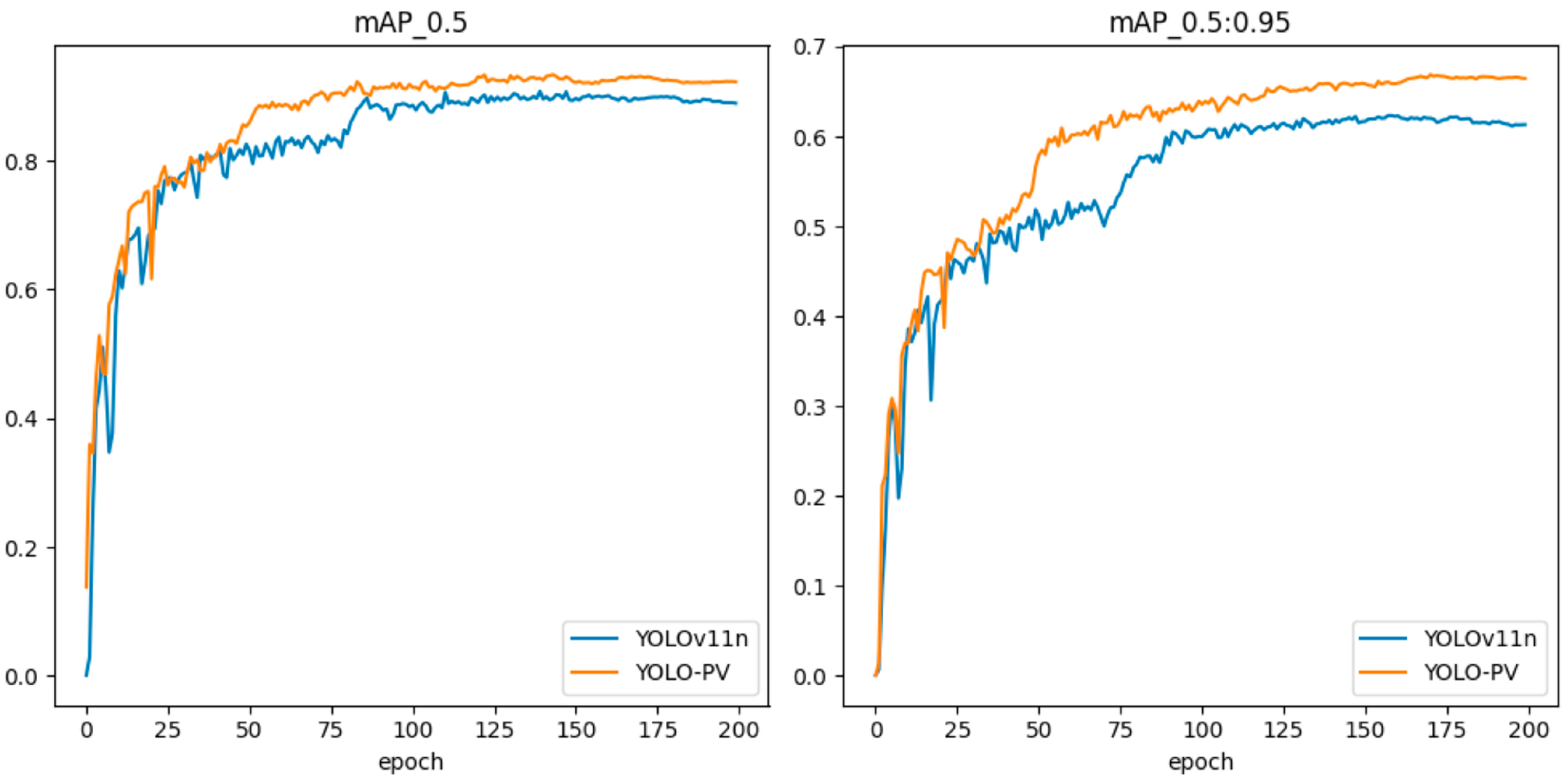 Figure 6 illustrates the training convergence curves of mAP@0.5 and mAP@0.5:0.95 for YOLO11n and YOLO-PV. As observed, YOLO-PV converges faster during the early training phase and exhibits smoother, more stable curves in the later epochs. It ultimately achieves higher accuracy on both metrics, demonstrating that the enhanced backbone and multi-scale fusion structure improve learning stability and optimization efficiency.