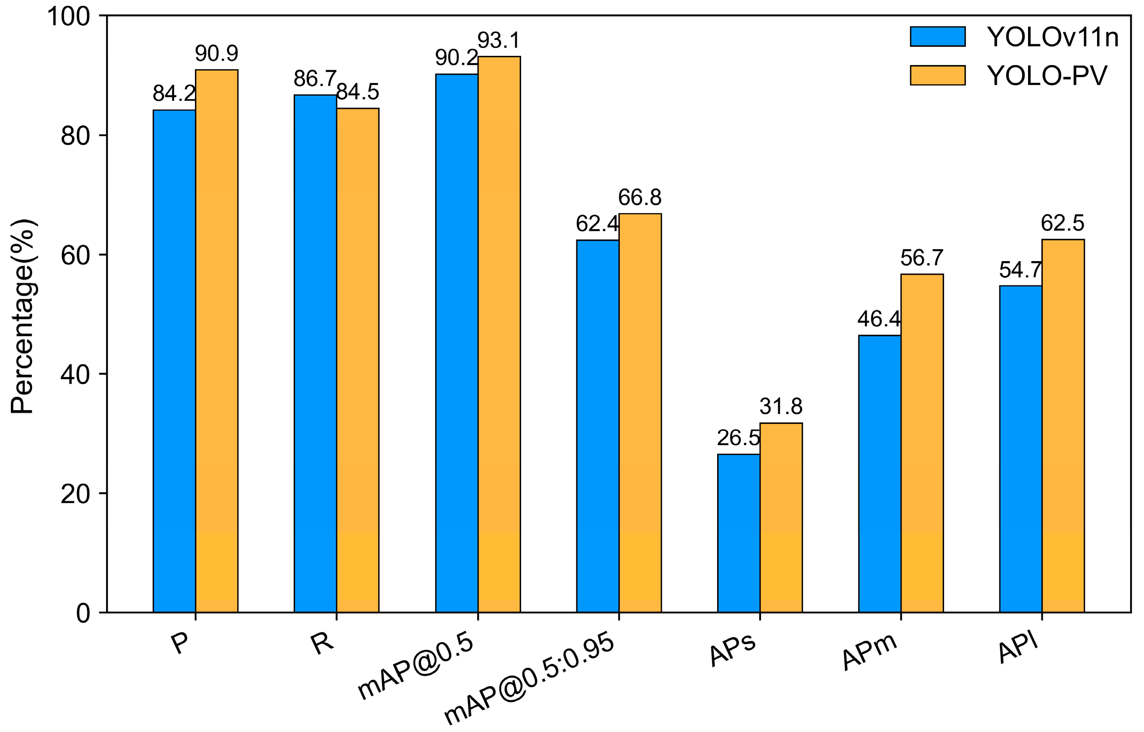 Figure 7 presents a bar chart of key evaluation metrics. YOLO-PV outperforms YOLO11n in Precision (P), Recall (R), mAP@0.5, and mAP@0.5:0.95, with improvements of 6.7%, 2.2%, 2.9%, and 4.4%, respectively. Additionally, in multi-scale detection performance, YOLO-PV achieves AP_S = 31.8%, AP_M = 56.7%, and AP_L = 62.5%, indicating a stronger capability for identifying small and fine defects compared to the baseline model.