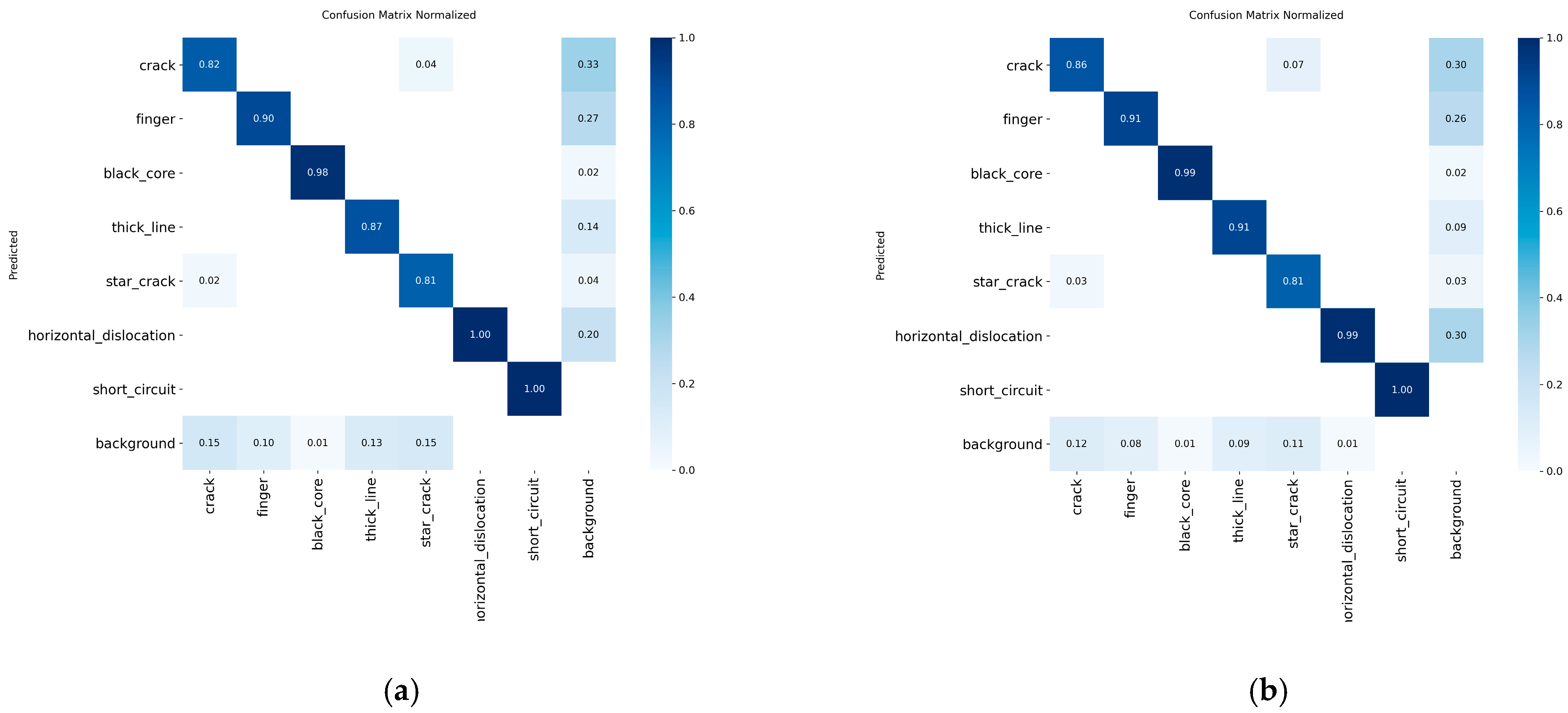 Figure 8 shows the confusion matrices for four representative defect types, including crack, finger, black core, and short circuit. The YOLO-PV model exhibits deeper diagonal regions and fewer off-diagonal errors, reflecting higher classification accuracy and localization precision. Particularly for samples with blurred boundaries or small defect areas, YOLO-PV maintains stable and consistent predictions, confirming its robustness against noise and complex textures.