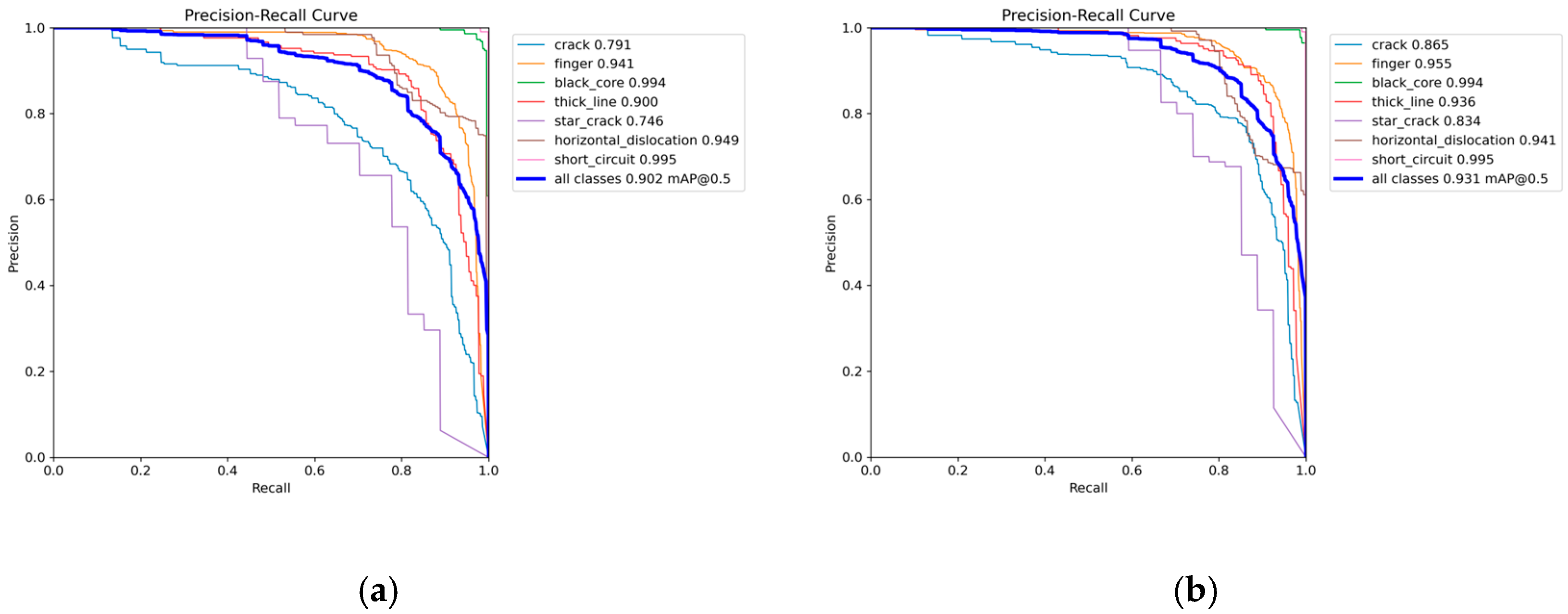YOLO-PV shows significant improvements in AP values across various categories, with notable increases in Crack (from 79.1% to 86.5%), finger (from 94.1% to 95.5%), and star_crack (from 74.6% to 83.4%). These results indicate that YOLO-PV is more capable of detecting small and hard-to-detect defects, particularly in complex backgrounds and small object detection tasks.