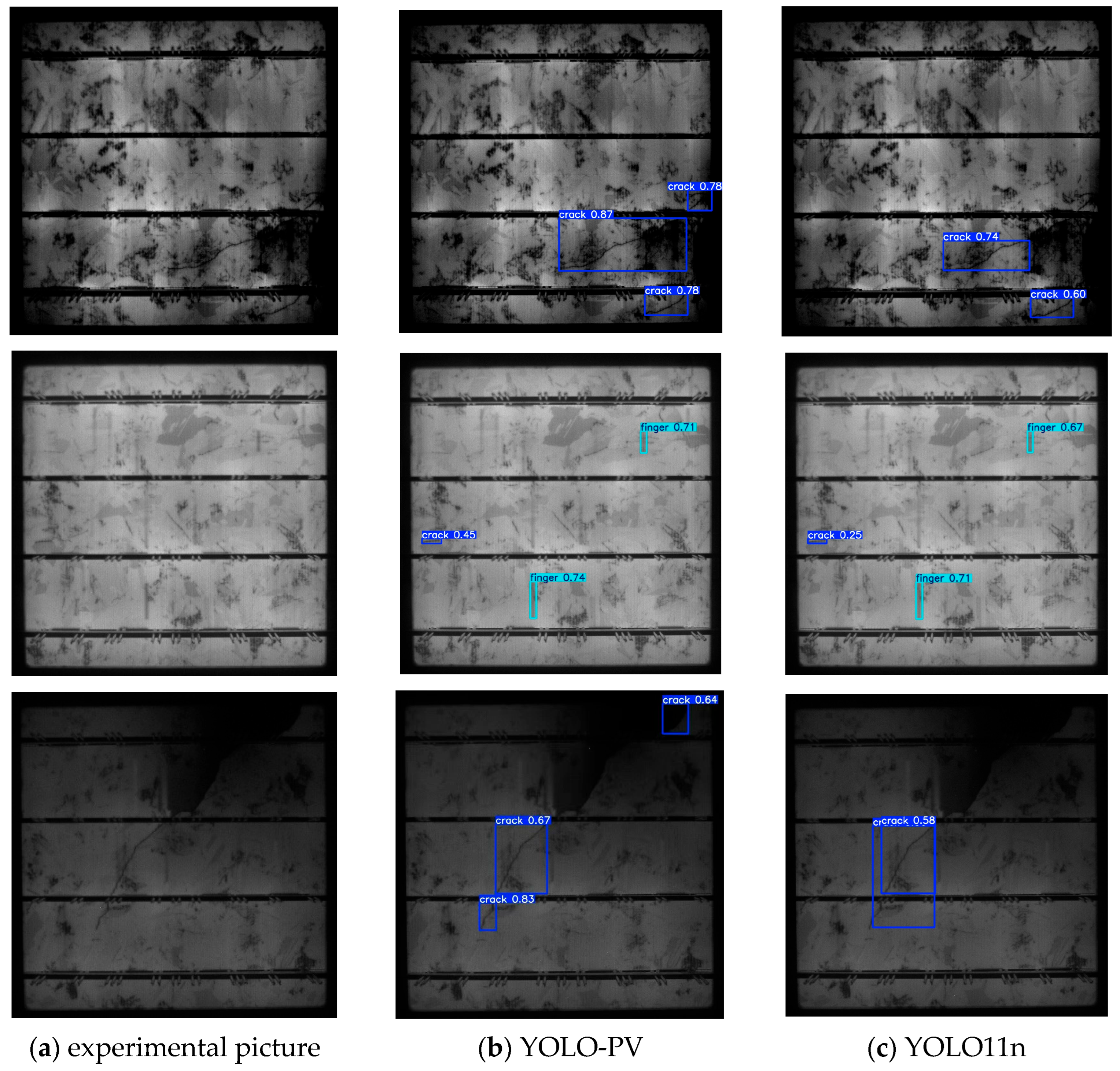 Figure 10. The upper row presents the detection results of the improved YOLO-PV model, while the lower row displays those of the baseline YOLO11n. It can be observed that YOLOv11n suffers from missed detections and inaccurate localization in certain samples, particularly under challenging conditions such as blurred crack edges or strong background noise. In contrast, the YOLO-PV model achieves more precise localization of defect regions and exhibits higher robustness and stability in identifying subtle defects such as micro-cracks and finger-like cracks. These qualitative observations are consistent with the improvements in quantitative metrics (e.g., mAP and error rates), further validating the effectiveness and practicality of the proposed method.