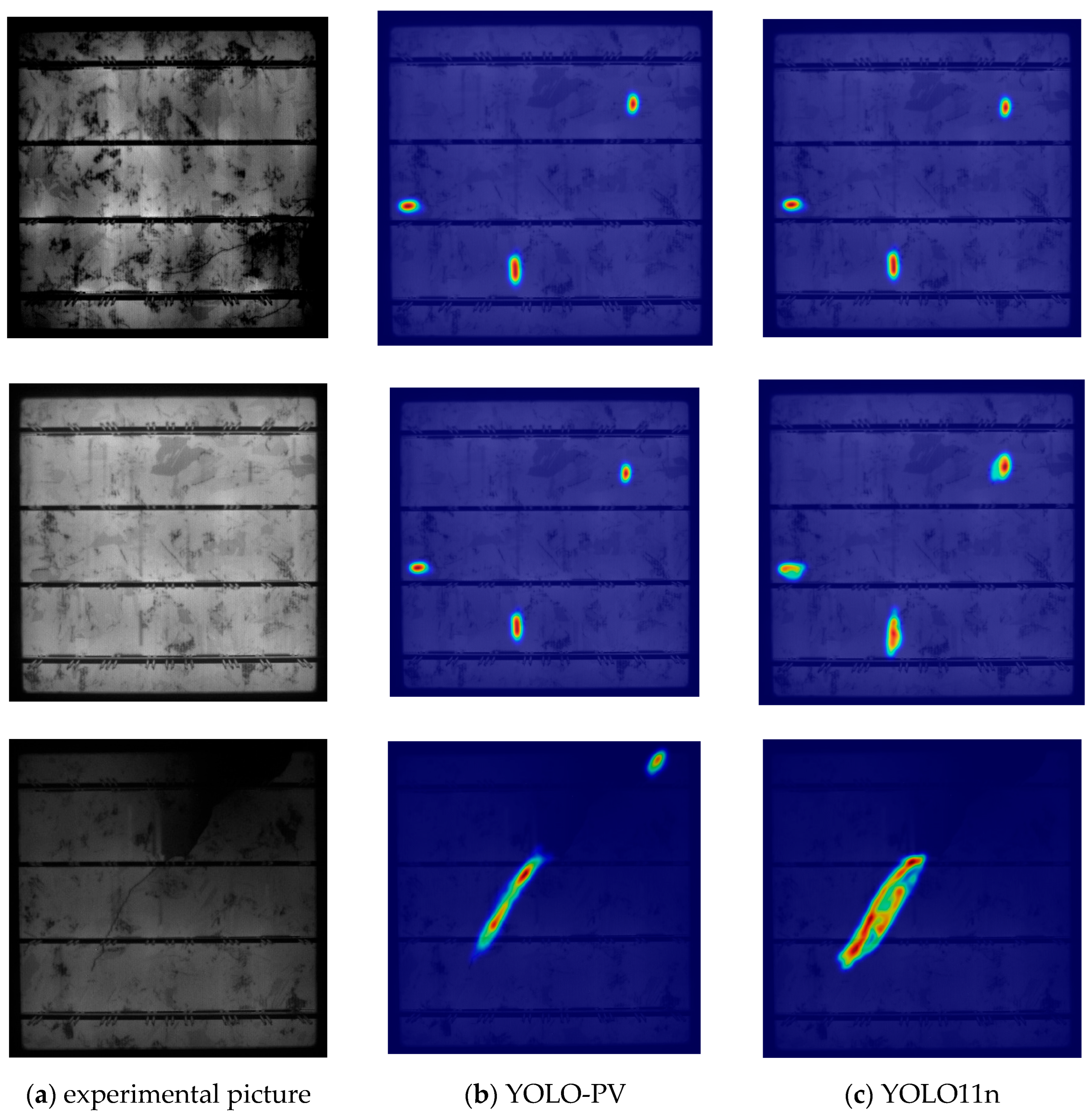 Figure 11. The Grad-CAM heatmaps provide intuitive insight into where the model focuses when identifying defects. The YOLO-PV model demonstrates concentrated attention on the actual defect areas (e.g., crack lines and black-core boundaries), whereas YOLO11n exhibits more scattered responses with attention partially focused on irrelevant background regions. This indicates that the improved architecture enables the model to capture more discriminative and semantically relevant features, enhancing both feature representation and interpretability.