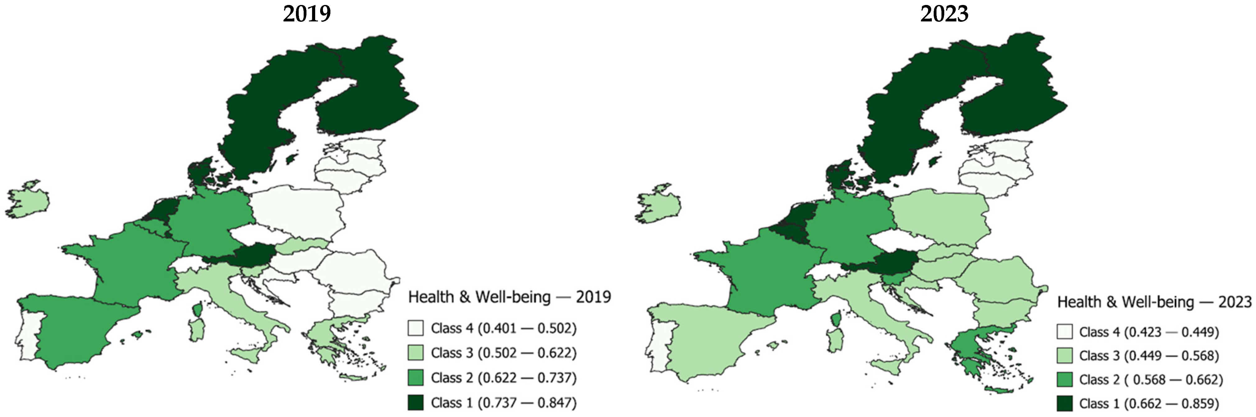4.2.2. Classification of EU Countries According to H&W in 2019 and 2023 Using QGIS