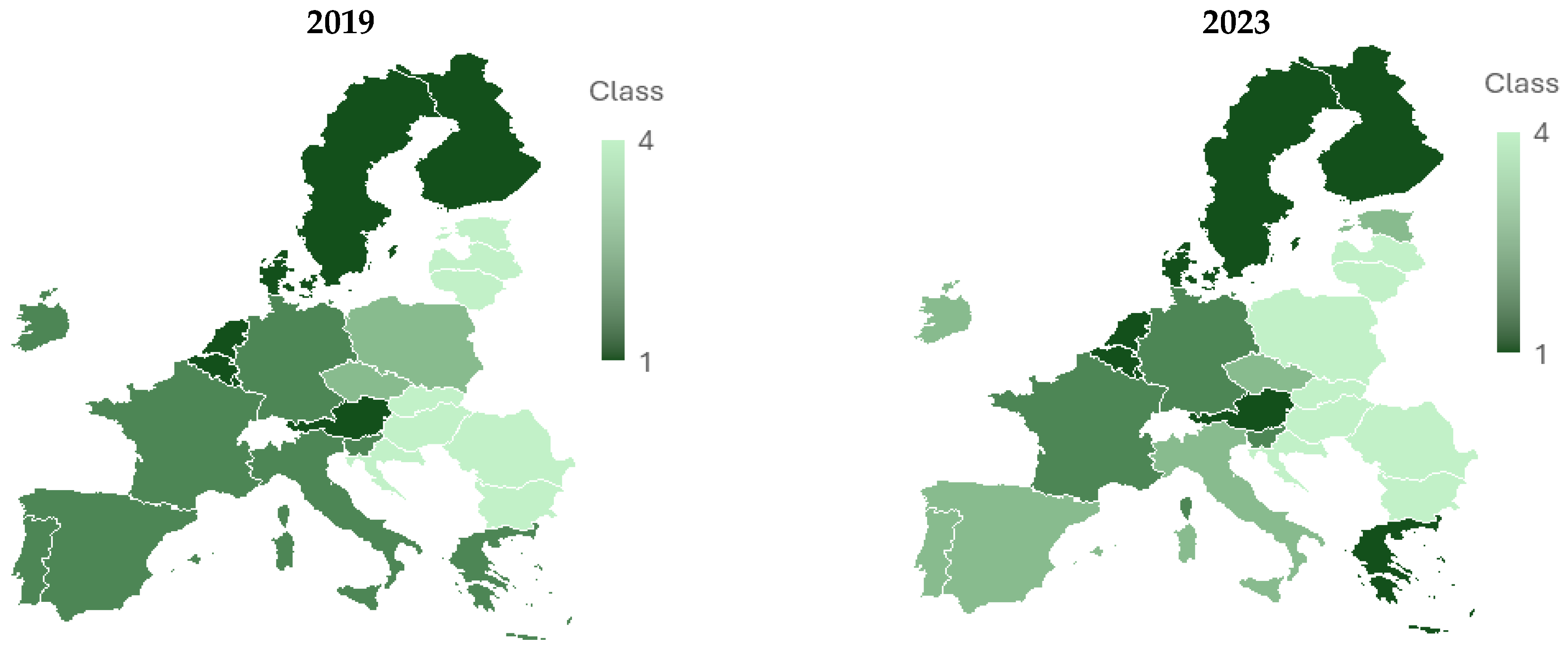 - A comparison of EU country classifications according to EP and H&W revealed a high degree of consistency between these dimensions. Countries with similar positions in both classifications in 2019 and 2023 were: Austria, Denmark, Finland, the Netherlands, and Sweden in the most favorable classes, and Bulgaria, Lithuania, and Romania in the least favorable ones.