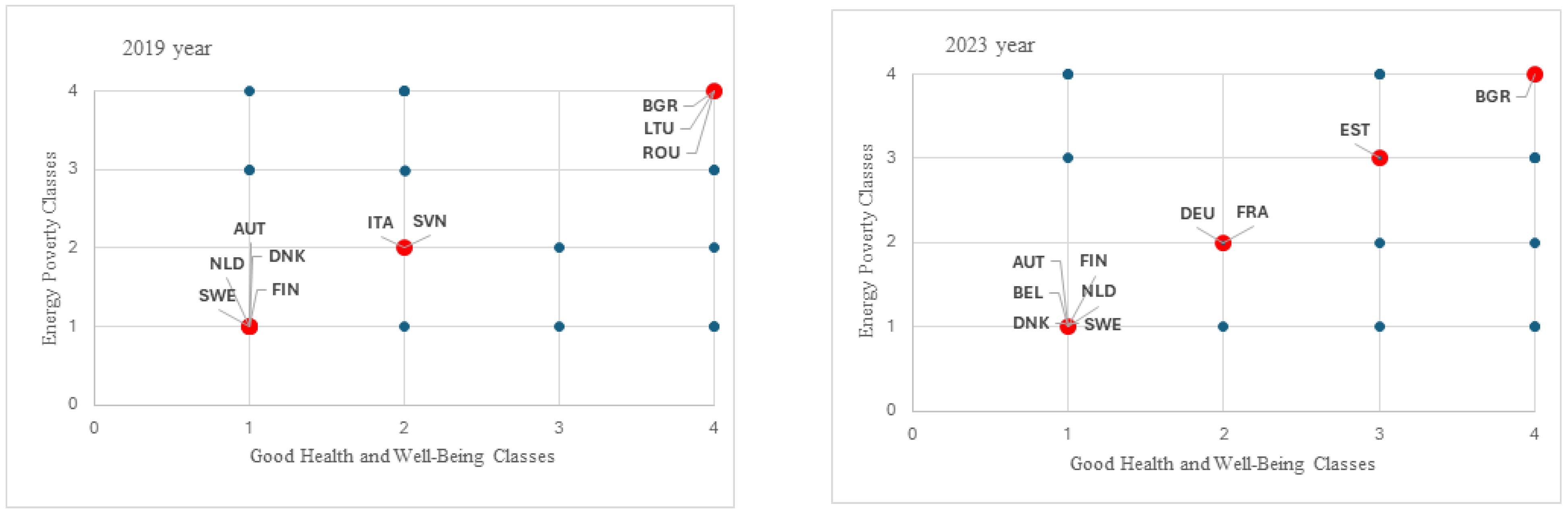 - Consistency among certain Member States in terms of EP and H&W. In 2019, Austria and the Netherlands were in the most favorable class in terms of both H&W and EP. In contrast, in 2023, only the Netherlands maintained a high, consistent position in the most favorable class in terms of the phenomena studied. Ireland and Bulgaria ranked in classes indicating an unfavorable situation in terms of both EP and H&W.
