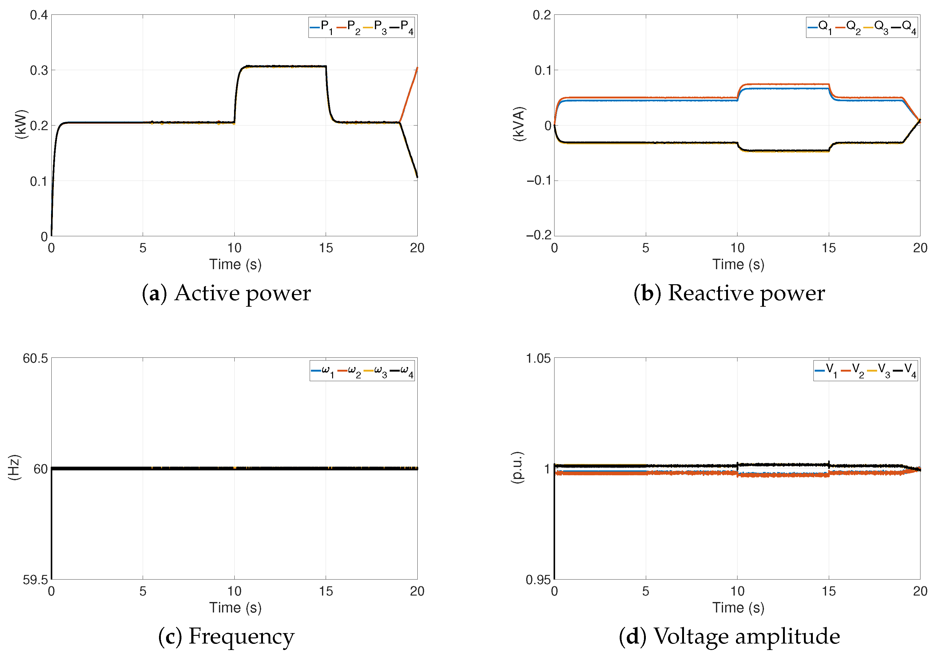 - Rosero, C.X.; Velasco, M.; Martí, P.; Camacho, A.; Miret, J.; Castilla, M. Active Power Sharing and Frequency Regulation in Droop-Free Control for Islanded Microgrids Under Electrical and Communication Failures. IEEE Trans. Ind. Electron. 2020, 67, 6461–6472. [Google Scholar] [CrossRef]