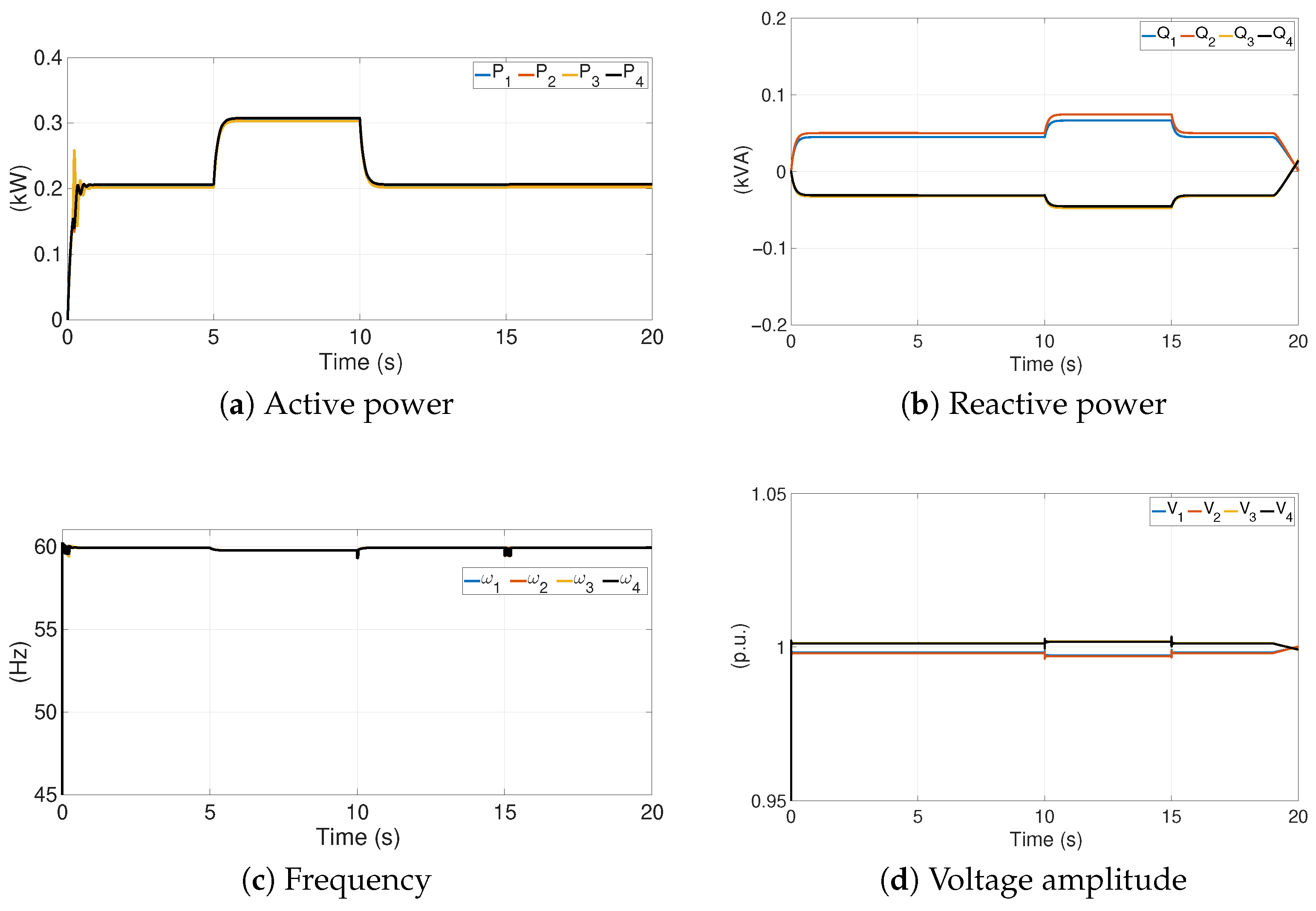 - Nasirian, V.; Shafiee, Q.; Guerrero, J.M.; Lewis, F.L.; Davoudi, A. Droop-free distributed control for AC microgrids. IEEE Trans. Power Electron. 2016, 31, 1600–1617. [Google Scholar] [CrossRef]