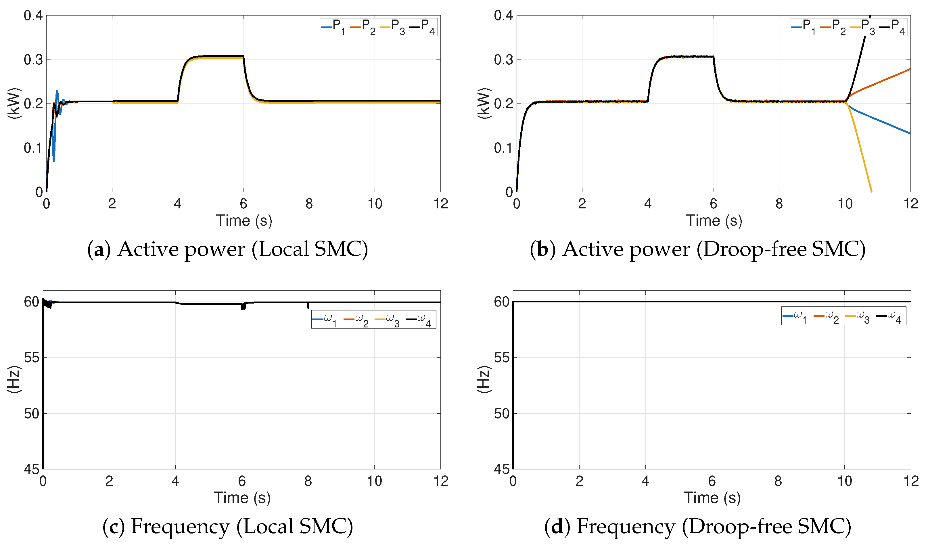 Droop-free SMC (with communication) | Precise frequency and power sharing Fast convergence under ideal communication conditions | Vulnerable to communication failure |