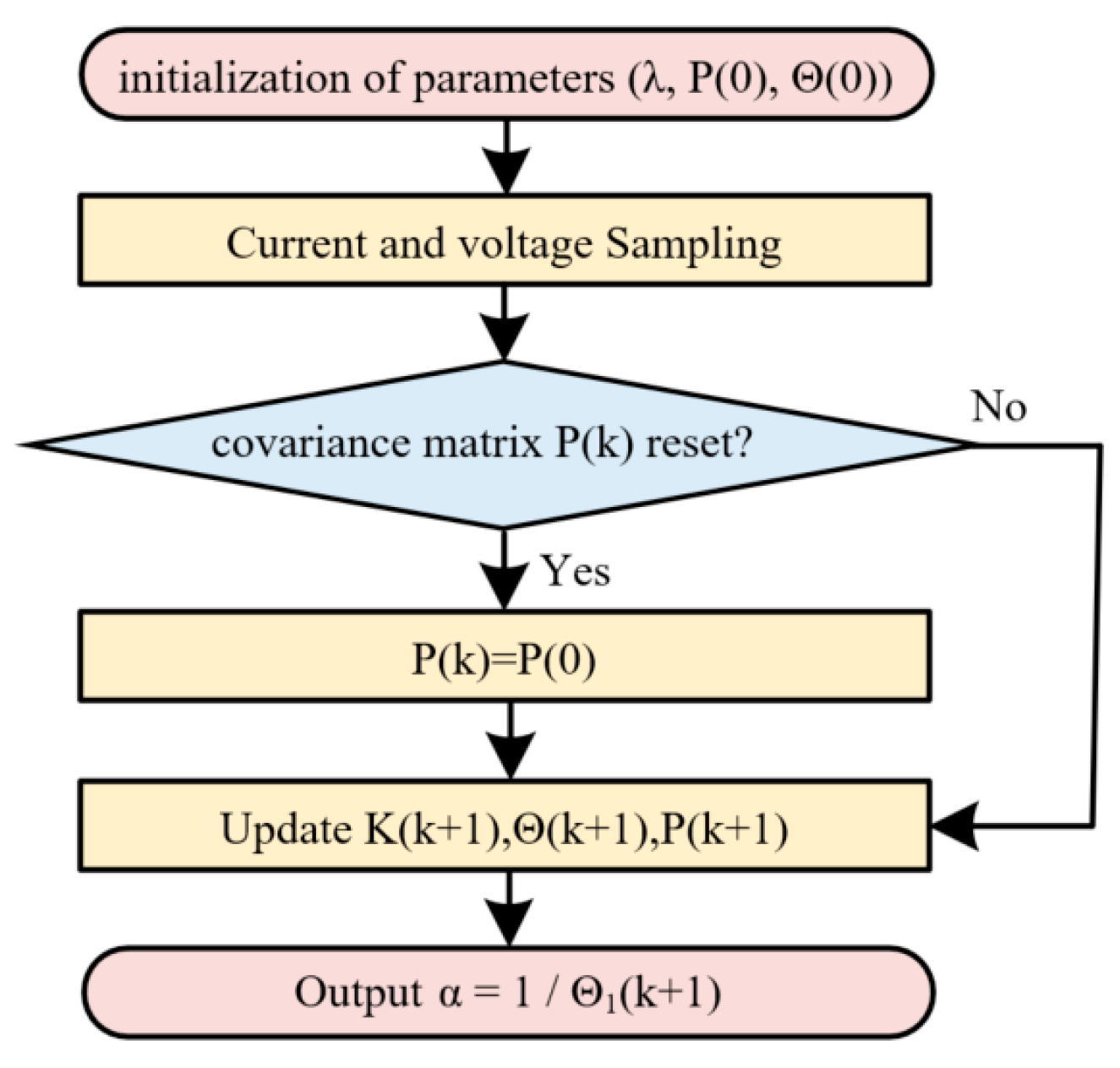To address these limitations, two modifications are proposed to enhance the estimation performance of traditional RLS method. First, a voltage input filter is combined with voltage threshold detection. When an abrupt voltage transition is detected, the covariance matrix is immediately reset to its initial values. Simultaneously, dynamic gain K(k) is constrained to limit amplitude magnitude. This dual intervention prevents the covariance matrix and gain from becoming too large, thereby avoiding abrupt changes in parameter estimation. Second, during non-conduction intervals, the covariance matrix should be reset and the accumulated estimation errors cleared.