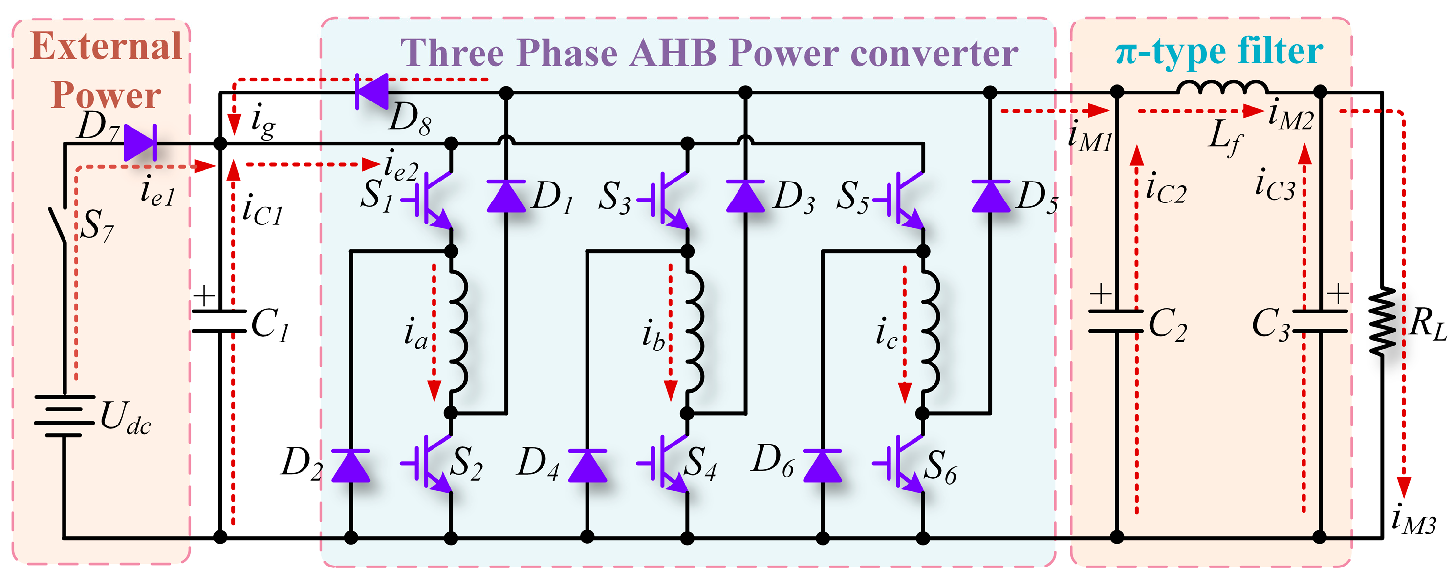 Figure 6, which consists of a three-phase asymmetric half-bridge (AHB) converter, a CLC filter and an external voltage source. The excitation bus and the generation bus are isolated by diode D