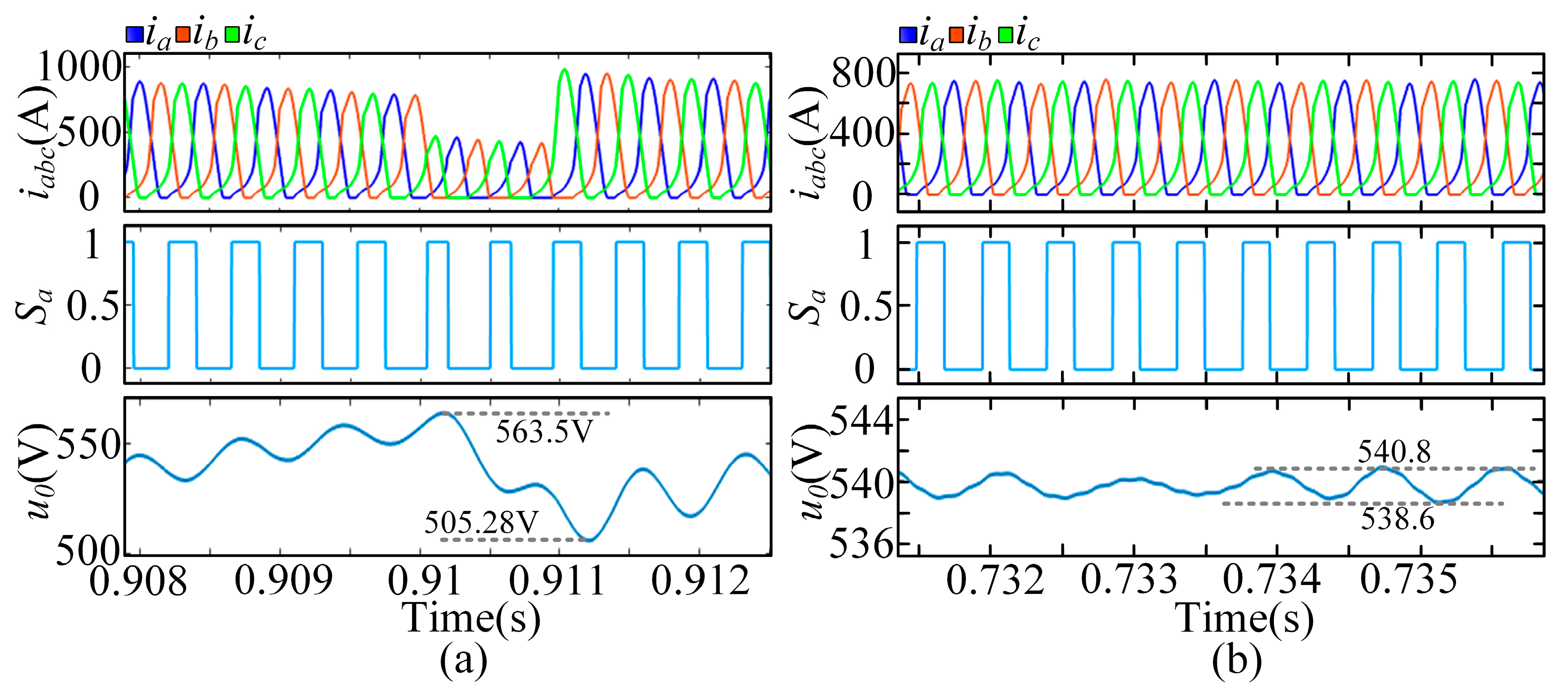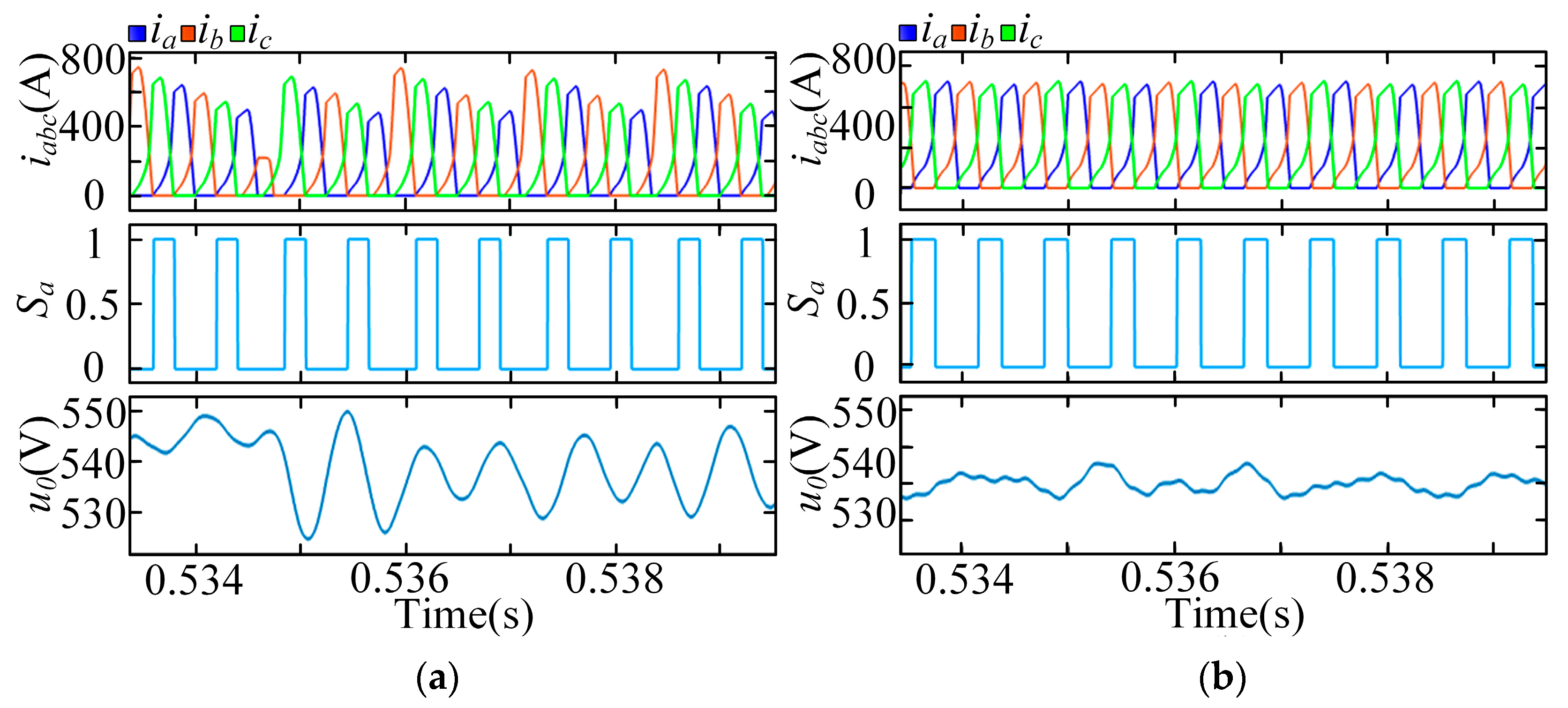 Figure 10), the conventional method exhibits significant imbalance in the three-phase currents, which is primarily caused by discrete control delay under high-speed operation. The maximum phase current reaches 736 A, whereas the minimum is only 221 A. Furthermore, the bus voltage shows considerable ripple, with a peak ripple amplitude (