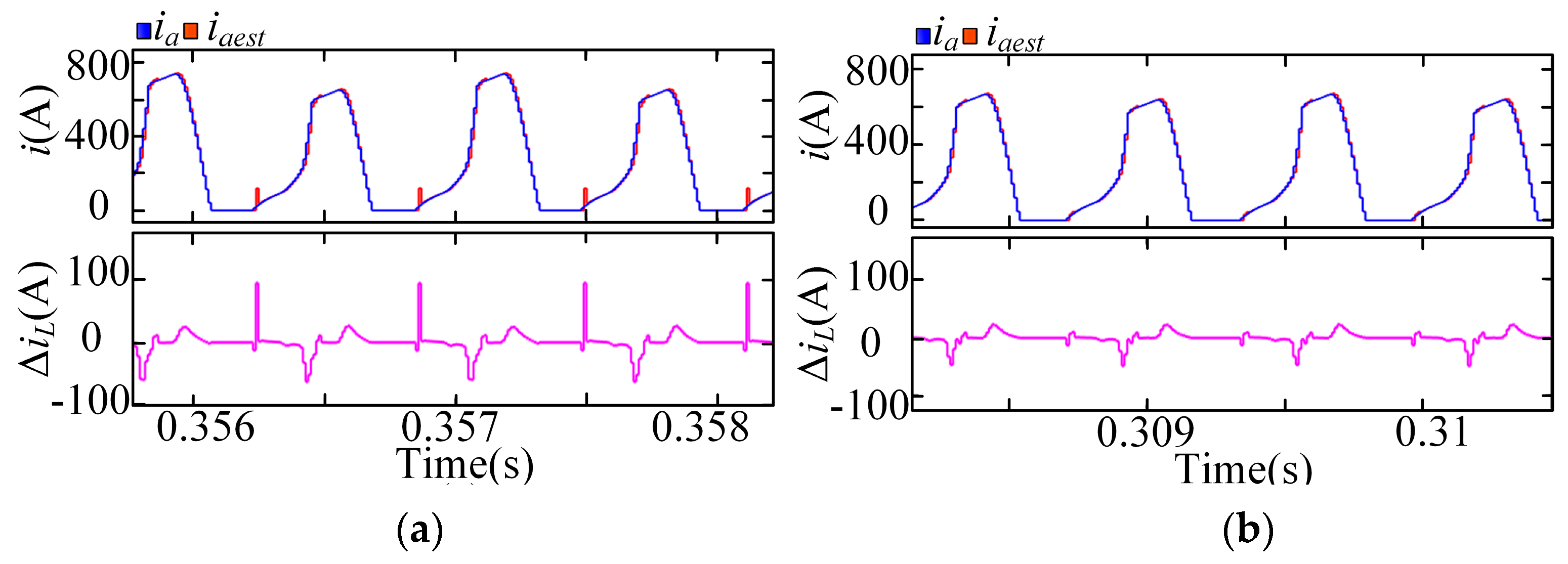 Figure 12. It can be observed that the conventional ESO exhibits significant estimation errors, particularly at the phase current turn-on position, where the maximum prediction error reaches 95 A. This leads to noticeable imbalance in the phase current amplitude. In contrast, the proposed ESO reduces the maximum current estimation error to 48 A, a 50% improvement over the conventional ESO.