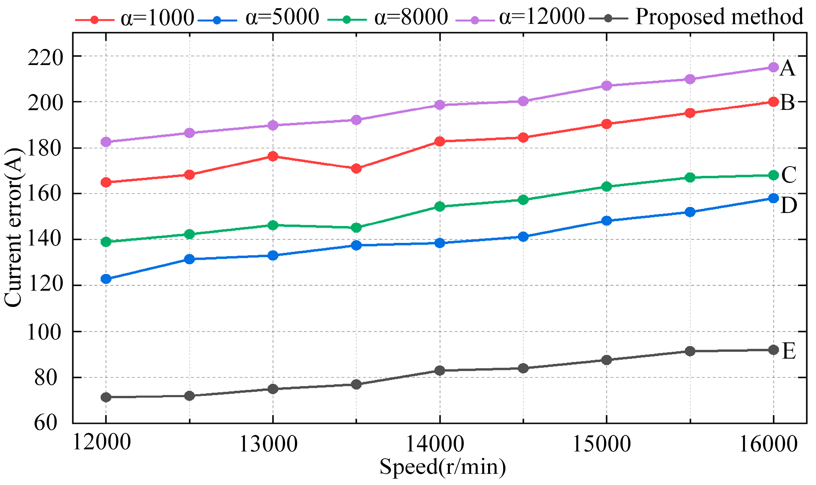 Figure 13, the ESO based on RLS achieves the best current estimation accuracy across the entire speed range. The current estimation error is reduced by 42% to 61% compared to the fixed-α ESO. Furthermore, the estimation error nearly increases with speed, demonstrating improved robustness at high speed.