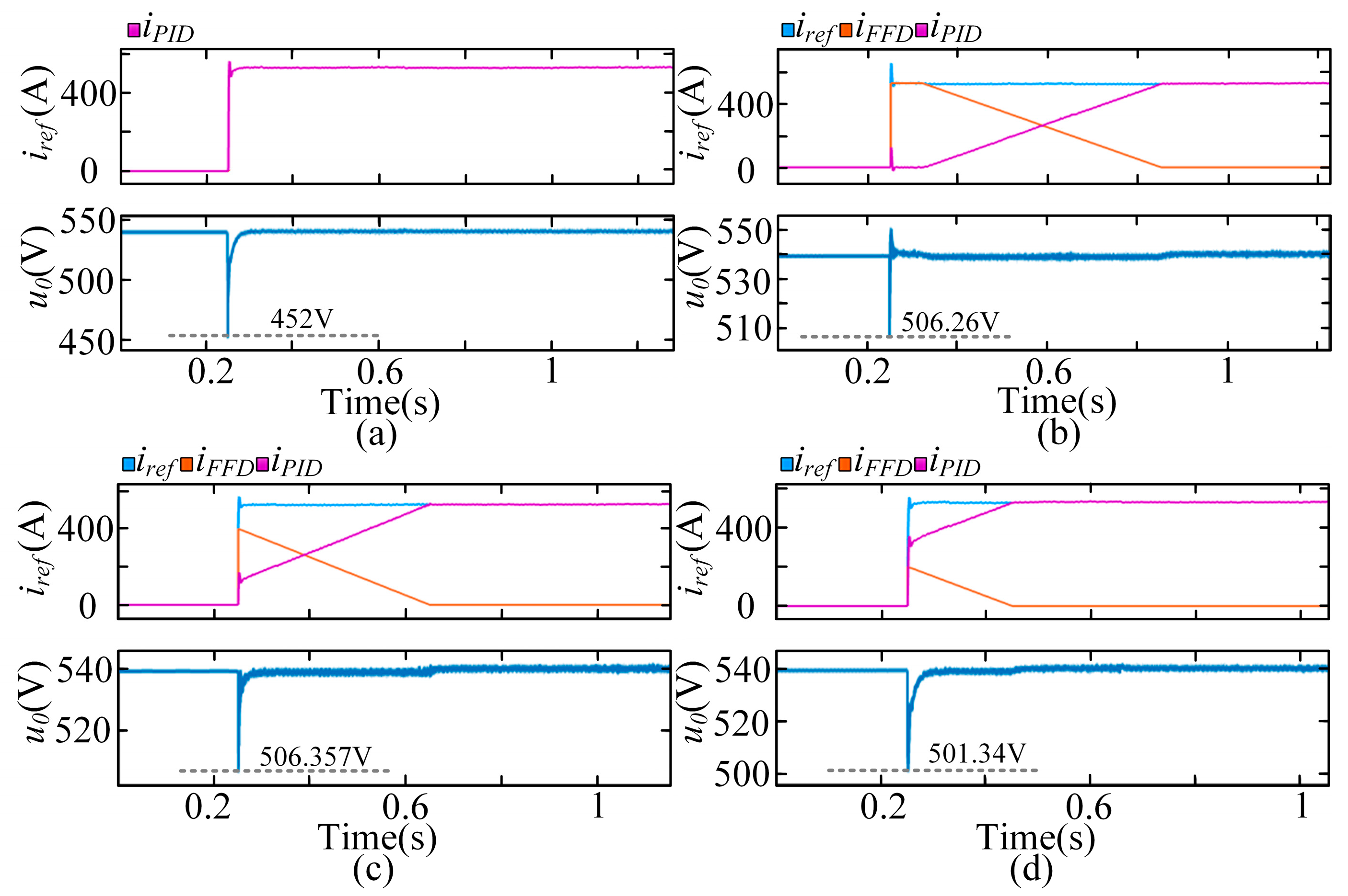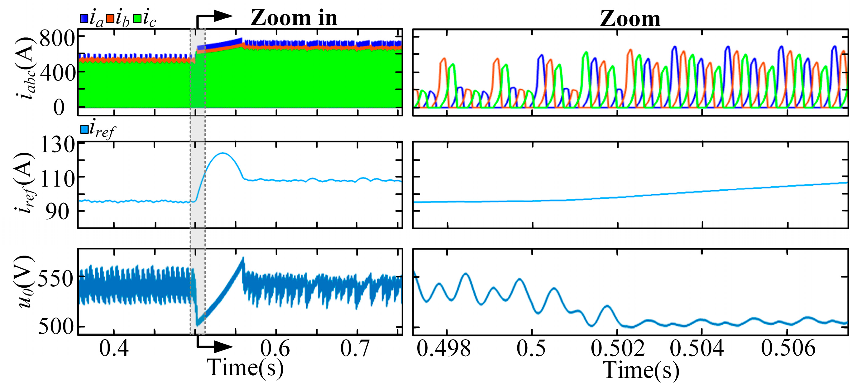 Figure 15, with the conventional method, a sudden load increase caused the voltage to drop quickly to 500 V. Due to the PID controller’s integral effect, the reference current increased slowly, and the voltage took 63 ms to recover. In contrast, the proposed algorithm enabled faster response, with voltage recovery within 10 ms. During the transient, the voltage only dropped to 528.4 V, 4.2% below the rated value. These results demonstrate that the proposed method exhibits stronger robustness and stability than the traditional method.