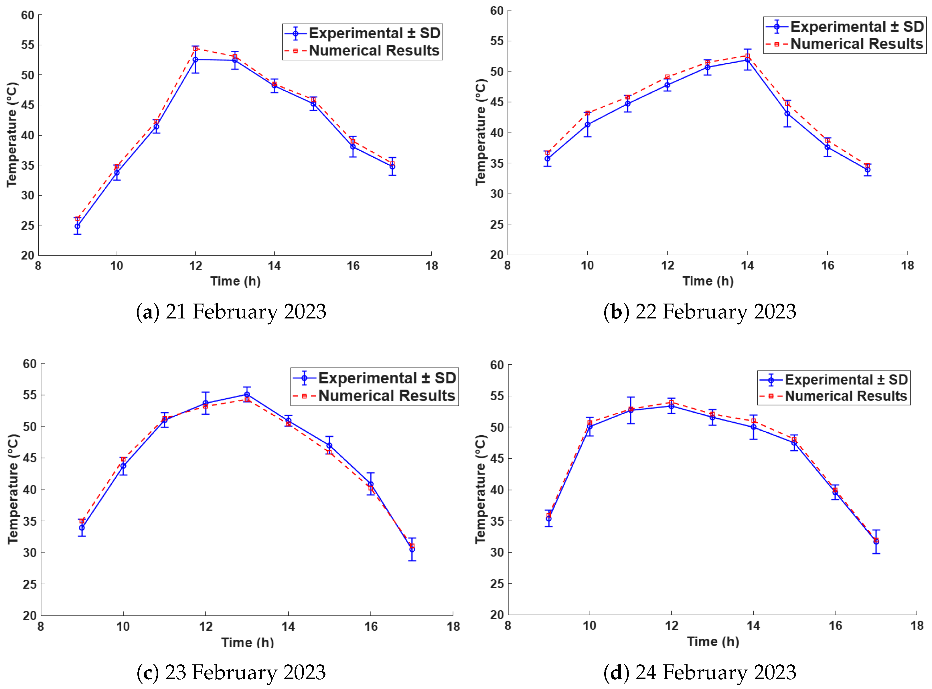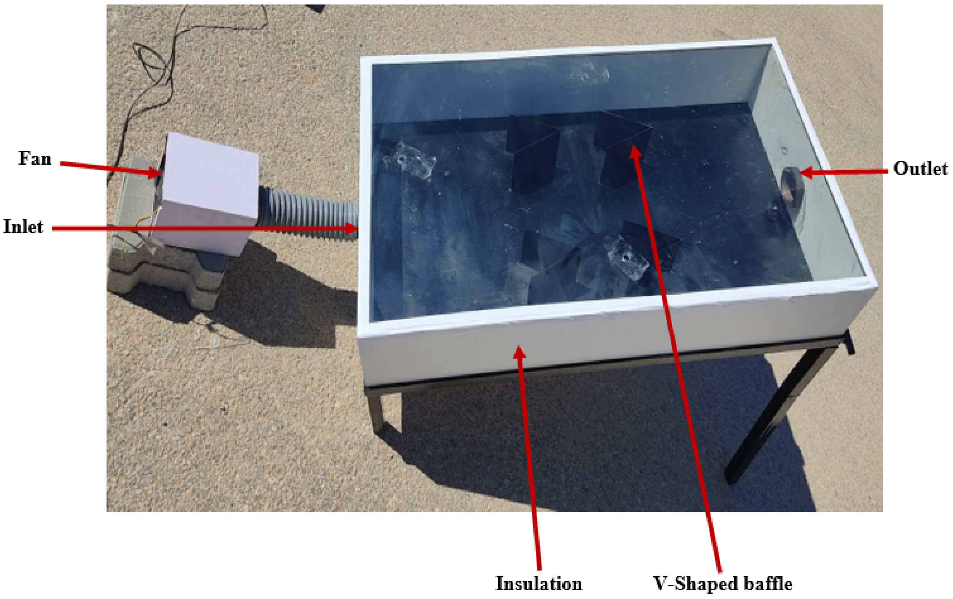 This study investigates the thermal efficiency of a solar air heater (SAH) equipped with large V-shaped fins through a comprehensive combination of experimental and numerical analyses. The validity and accuracy of the numerical model were confirmed by comparing the predicted outlet air temperatures to measurements obtained during experiments, ensuring a reliable foundation for further analysis. The numerical investigations were systematically conducted to assess the effects of various fin configurations on the thermal performance of the SAH while maintaining a constant airflow velocity of 2.7 m/s. During the experimental test days, the SAH demonstrated a peak outlet air temperature of 55 °C, underscoring its effective heat transfer capabilities. A thorough analysis of the velocity distribution and air temperature within the SAH highlighted the significant influence of different fin designs on the internal flow dynamics. The introduction of V-shaped fins increased turbulence levels, facilitating improved fluid mixing and promoting a more uniform temperature distribution throughout the collector. This enhanced energy absorption was crucial for optimizing the overall thermal performance of the system. Among the various configurations tested, the design featuring eight V-shaped fins emerged as the optimal choice, achieving an overall thermal efficiency of 73%. This configuration not only maximized energy capture but also maintained a modest pressure drop increase. Economically, the prototype has a total cost of approximately USD 74.6 (∼215 TND), confirming its affordability and practicality for real-world applications. Overall, the findings demonstrate that the proposed V-shaped fin configurations effectively balance a high thermal efficiency, acceptable pressure drop, and low fabrication cost, making them viable solutions for solar air heating applications. Future research could further explore different materials, geometric modifications, and operational conditions to refine the design, as well as integrating drying chambers, phase change materials, thermal storage, or hybrid heating systems to enhance performance under varying solar conditions.