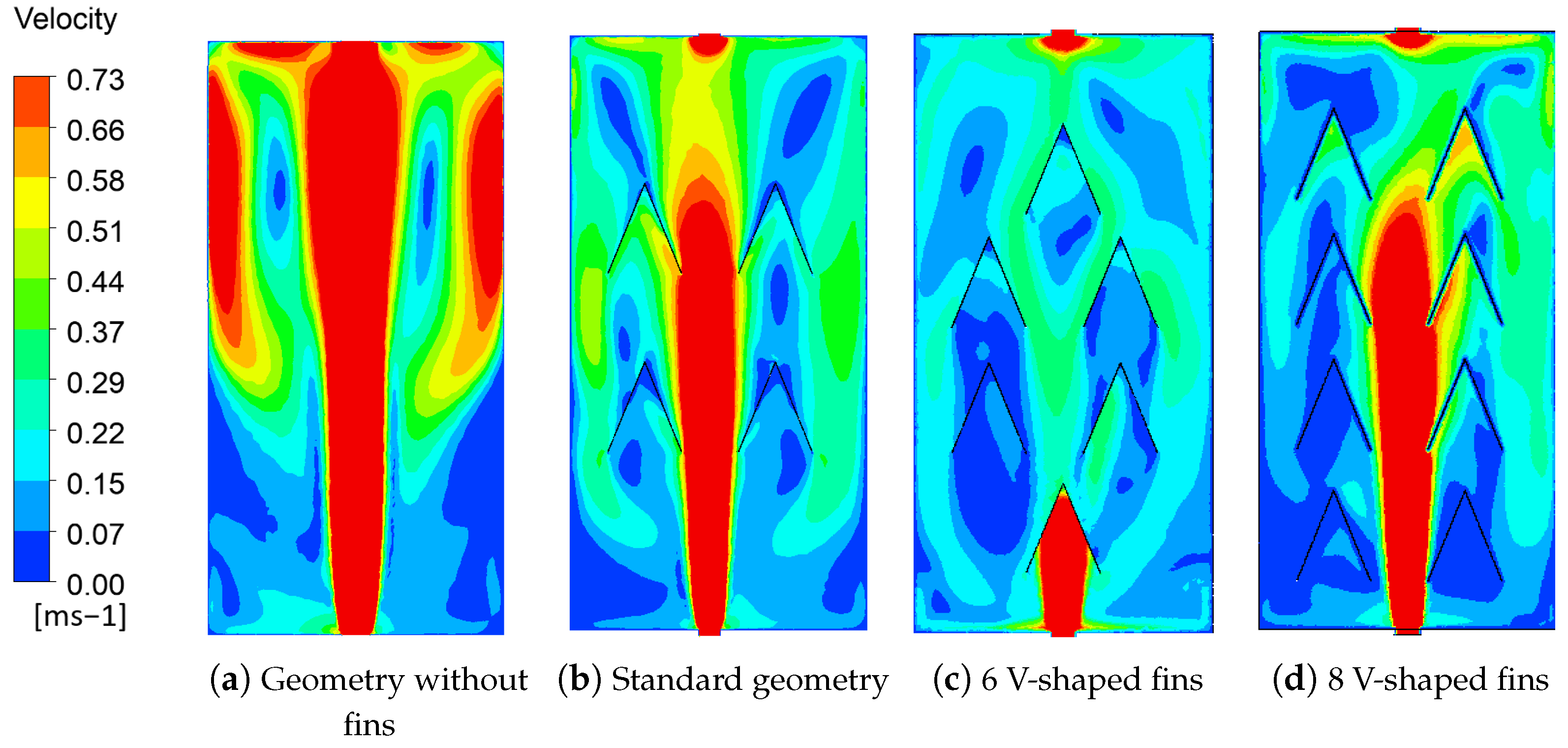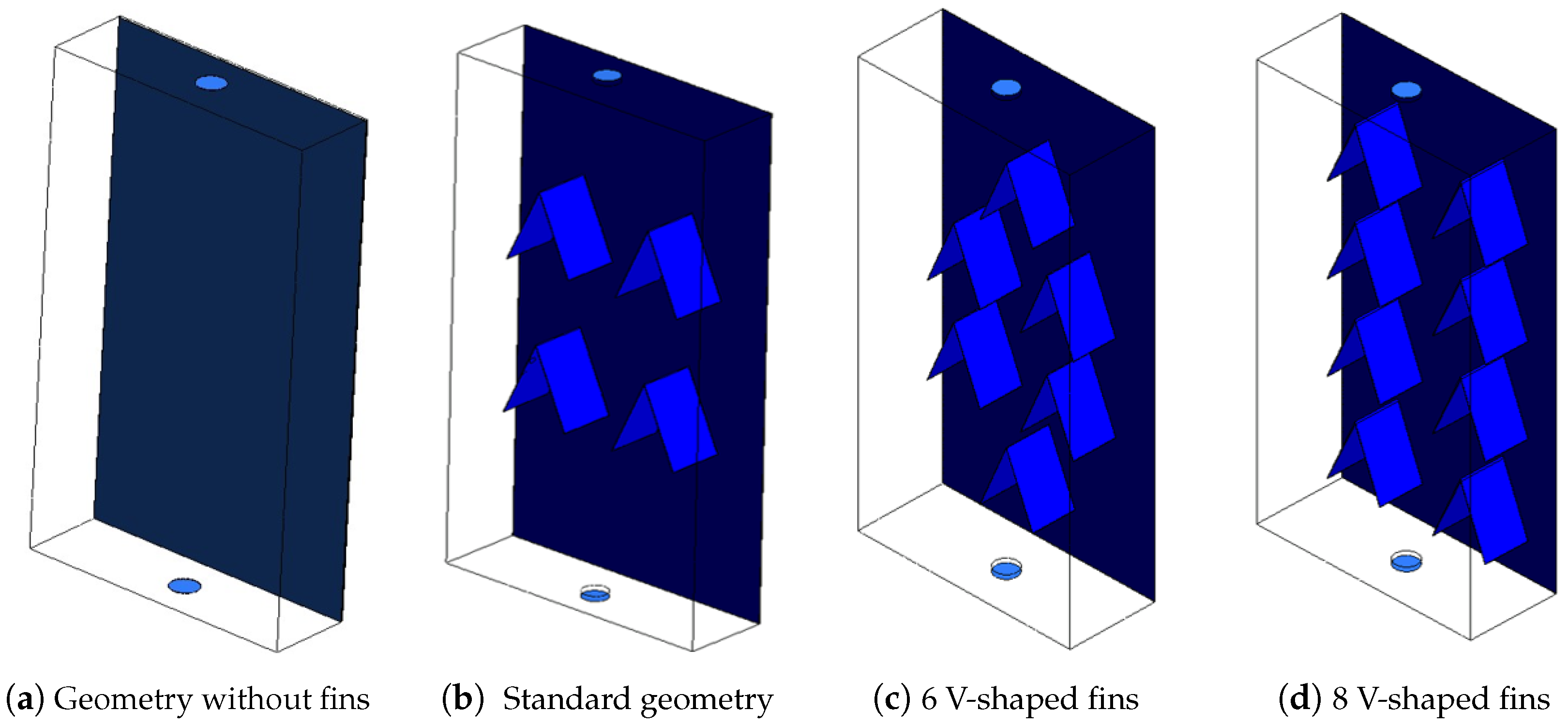 Past research has indicated that the thermal efficiency of a SAH is notably influenced by its geometrical characteristics. However, increased heat transfer often comes with highly complex or expensive solutions. Therefore, this study investigates a simple design using relatively inexpensive materials, while significantly enhancing heat transfer. The novelty of our SAH lies in its small size, the use of steel for the absorber plate, and the inclusion of specific large-scale fin designs in the collector. This combination ensures the SAH is extremely cost-effective, making it an attractive option for harnessing solar energy. This work contributes to a performance-based selection criterion for optimal fin design, enhancing practical applicability. Conventional SAHs often suffer from high maintenance requirements, material corrosion, and complex designs. This limits their deployment in cost-sensitive regions. By using locally available materials and incorporating large V-shaped fins, our design achieves a balance of affordability, durability, and enhanced heat transfer. This approach highlights the practical value of a “low cost and high heat transfer” SAH.