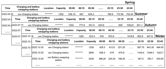 We collect 704,184 seasonal charging load profiles from 962 CBSSs in 2021–2022. Figure 2 presents the charging load dataset in tabular form, providing a detailed overview of the structure of the original data. Daily charging load profile of the CBSSs is segmented into 15-min intervals, so each profile has 96 data points.