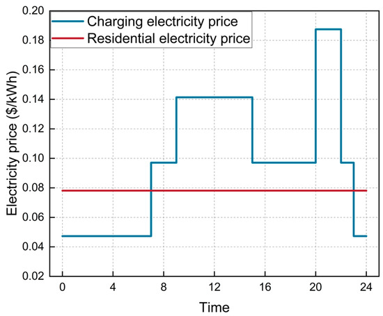 This section identifies the time intervals from the 96 daily periods for three types of CBSSs under typical seasonal conditions. These 962 CBSSs adopt a standardized time-of-use electricity price that excludes any additional charges, as shown in Figure 3. In 2023, the peak price (20:00–22:00) is set at 0.1875 $/kWh; the high-demand price (9:00–15:00) is 0.1414 $/kWh; the standard price (7:00–9:00, 15:00–20:00, and 22:00–23:00) is 0.0971 $/kWh; and the off-peak price (23:00–7:00) is 0.0473 $/kWh. In comparison, the residential electricity price remains at 0.0781 $/kWh throughout the day.