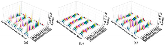 The probability distribution of the CCFs at any time on typical days of the four seasons for DCSs, PCSs, and BSSs is shown in Figure 4. The charging coincidence factor of CBSSs across the four seasons shows a multimodal distribution at various times. Over time, the probability distribution fluctuates in a wave-like pattern, regularly shifting between low and high CCFs.