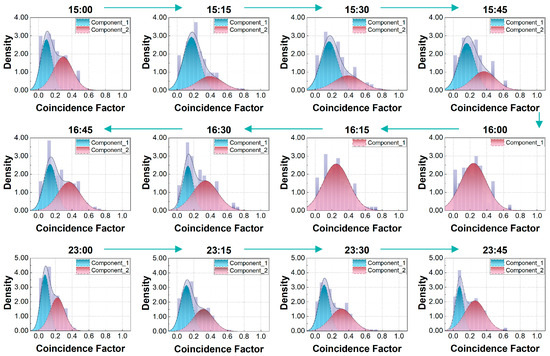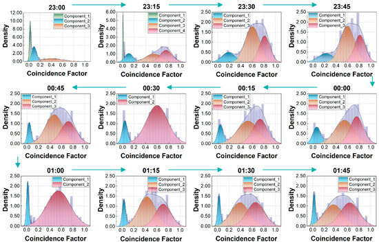 The overall trend at public charging stations during the three peak charging periods demonstrates a gradual shift of the Gaussian component from the left to the right, exhibiting a wave-like progression. Specifically, as time progresses, the charging coincidence factor gradually transitions from the region below 0.2 to above 0.4. Furthermore, during the transitional moments when the charging coincidence factor increases, the number of Gaussian components also increases by one or two, as observed at time points such as 06:00, 06:45, and 15:00.