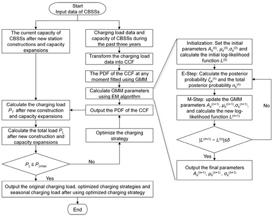 The specific execution steps of the proposed method are outlined in Figure 8. First, historical charging load data and capacity information from CBSSs are input. The charging load data is then converted into the CCF, and GMM is applied to fit the PDF of the seasonal CCF. The EM algorithm is employed to estimate the parameters of the GMM and derive the PDF of the CCF.