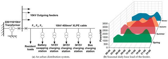 A generic urban power distribution system in Wuhan is presented in Figure 9a. The system consists of a 220/110/10 kV, 240 MVA transformer and 12 outgoing 10 kV feeders (F1–F12). Feeders F1, F2, and F3, comprising the three-phase 10 kV cable system, utilize YJV22 3 × 400 mm2 cross-linked polyethylene cables installed through a ducted laying method for efficient power distribution. The 10 kV feeder supplies five charging and swapping stations: Public Charging Station 1 (630 kVA, put into operation in late 2022), Public Charging Station 2 (upgraded from 2000 kVA to 2500 kVA by the end of 2022), Public Charging Station 3 (3600 kVA), the Bus Charging Station (expanded from 2000 kVA to 3600 kVA by the end of 2022), and the Battery Swapping Station (1250 kVA). Figure 9b illustrates the seasonal typical daily base load of the 10 kV feeder.