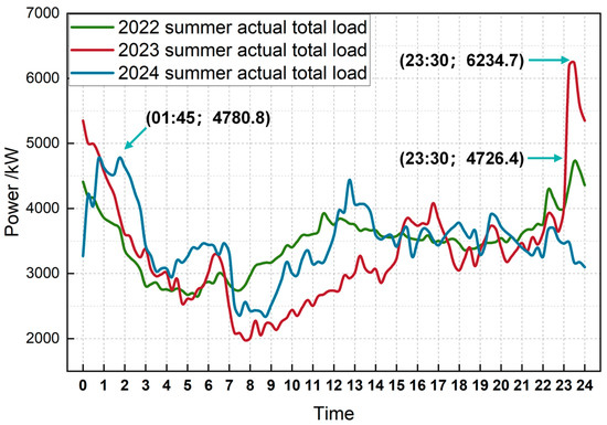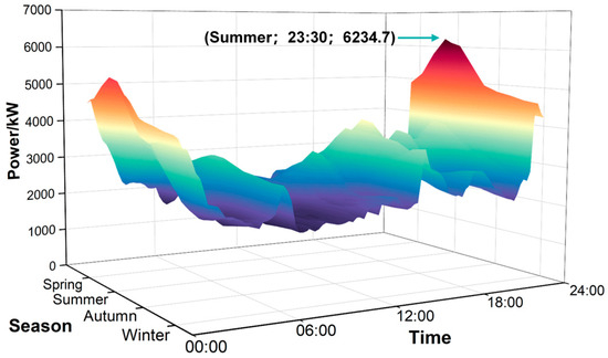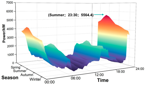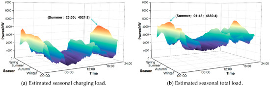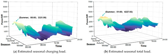 Parameters of probabilistic load model are estimated utilizing charging load data from 962 stations in Wuhan during 2021–2022 to estimate seasonal peak charging loads in 2023, following new construction and capacity expansions. The seasonal charging load, estimated using a probabilistic model, is presented in Figure 10. In 2023, the daily maximum charging loads exhibit a distinct triple-peak pattern, occurring at 23:00–01:00, 06:00–07:00, and 15:00–17:00, with a consistent surge around 23:00. The annual peak load occurs at 23:30 in summer, reaching 5564.4 kW, which is 28.63% higher than the lowest nighttime peak observed in winter. Daytime peak loads occur at 16:45 in summer and 15:30 in winter, surpassing those in spring and autumn afternoons by 17–20%. These findings highlight significant seasonal variations in EV charging load, emphasizing their critical importance for effective grid planning and load management.
