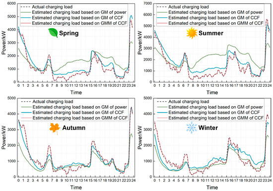 Overall, the charging load demonstrates a seasonal variation, being highest in summer, followed by spring, autumn, and winter. The GMM exhibits significantly higher accuracy than the GM in estimating seasonal charging loads. However, as charging loads decrease, the accuracy of the GM improves, further supporting the observation that early charging load distributions were well-aligned with Gaussian characteristics. During the initial stages of EV adoption, when market penetration was still low, charging loads at specific time points approximately followed a Gaussian distribution, making the GM a reasonable choice for early research. However, the reliance on public charging load data during that period limited the applicability and accuracy of GM in estimating loads of diverse types of charging and battery swapping stations.