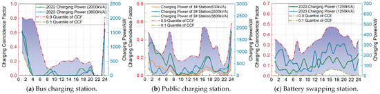 As presented in Figure 12, the loads of different types of CBSSs exhibit considerable variability across capacity levels. However, for each type, the charging loads consistently lie within the probability domain defined by the charging coincidence factor, with their fluctuation trends closely aligning with those of the charging coincidence factor. In contrast to direct analysis of charging loads, which is often complicated by the influence of capacity expansions, the analysis method based on charging coincidence factors demonstrates strong generalizability.