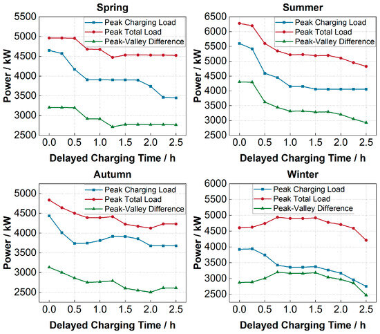 Owing to the centralized management of bus charging stations by the bus company, the implementation of a delayed charging strategy is both practical and effective. The bus charging stations operate daily from 5:30 to 23:00, with centralized charging starting thereafter and extending until 3:00. To ensure uninterrupted bus operations, the maximum allowable charging delay is limited to 2.5 h. The proposed load probability model and delay strategy are evaluated using 15-min intervals as the fundamental time unit. As illustrated in Figure 14, the optimization results recommend the following delayed charging strategies: a delay of 1.25 h in spring, 2.5 h in summer, 2 h in autumn, and 2.5 h in winter.