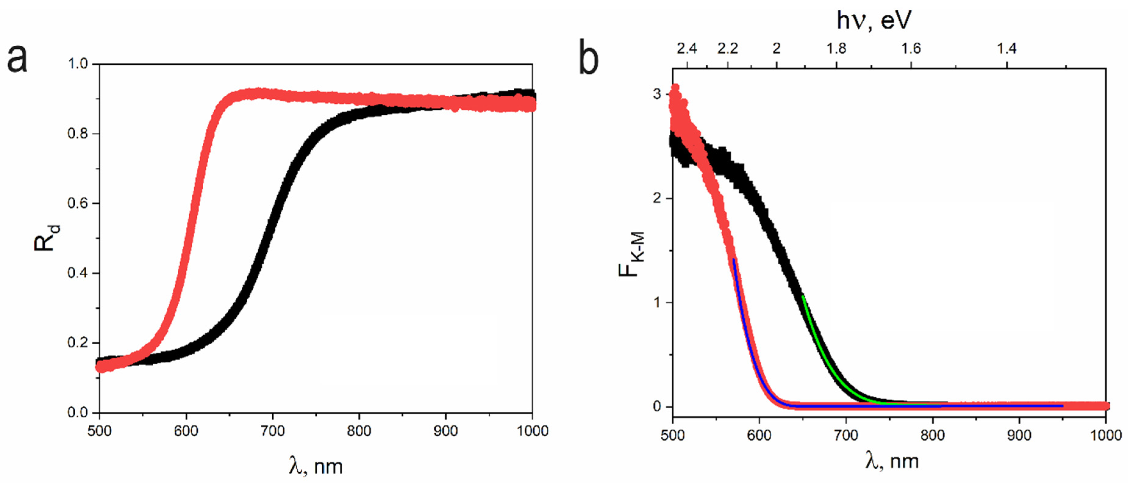 4.1. Light Absorption Properties and Kubelka-Munk Analysis