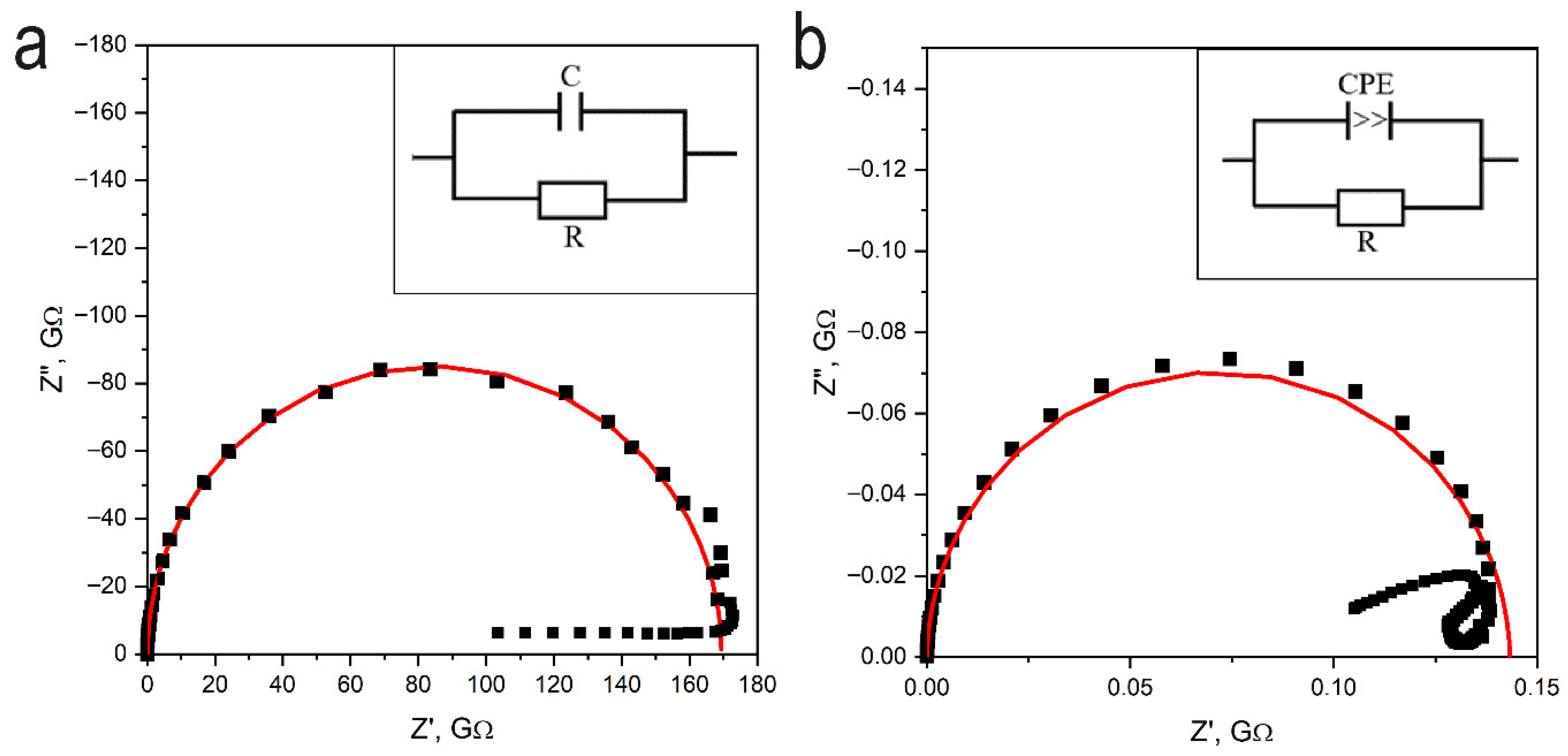 4.3. Impedance Spectroscopy Results and Equivalent Circuits