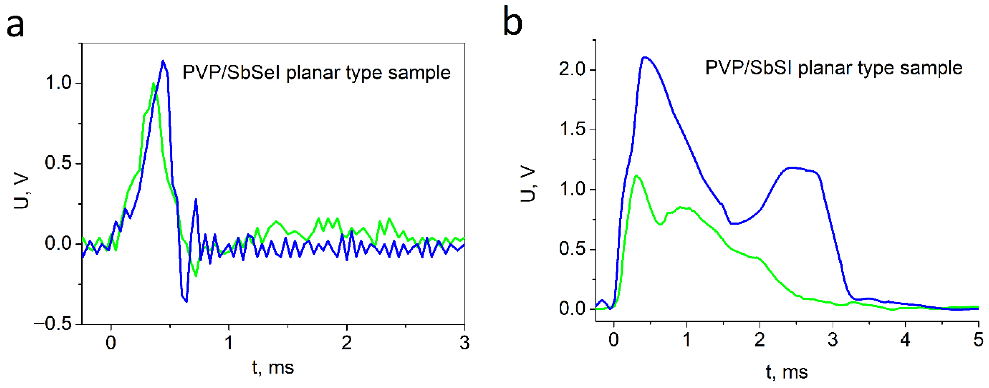 - Toroń, B.; Nowak, M.; Kępińska, M.; Szperlich, P. Mobility of ferroelectric domains in antimony sulfoiodide. Acta Phys. Pol. A 2014, 126, 1093–1095. [Google Scholar] [CrossRef]
