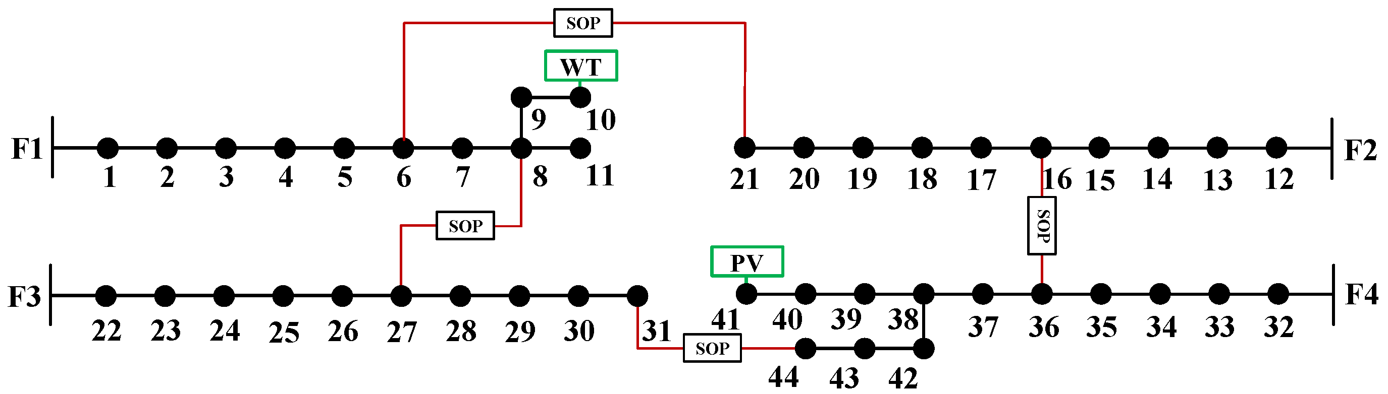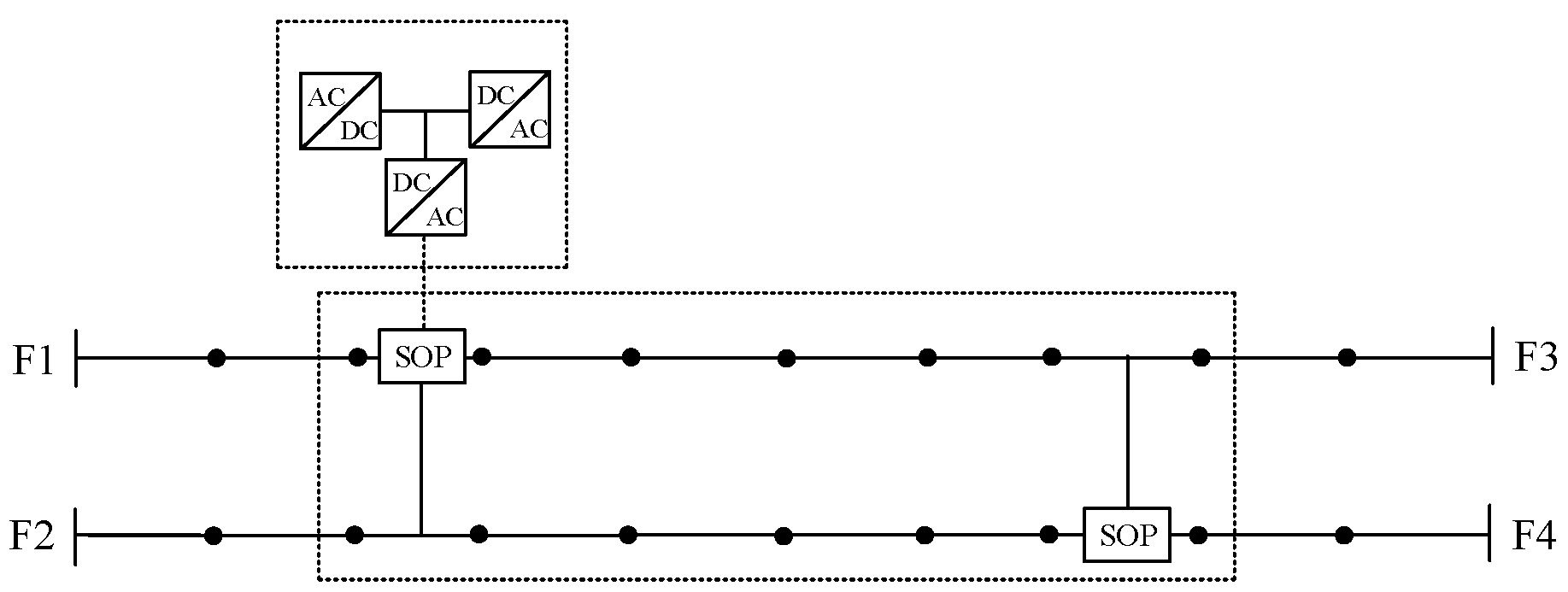 The future distribution system will integrate elements such as DG and demand response, resulting in increasingly complex and variable operational scheduling. Consequently, more flexible and interconnected network structures will be required. Building on the concept of honeycomb distribution networks and further extending it, a mesh distribution network is proposed, which is based on mesh topology and enables flexible closed-loop operation of the entire system. As shown in Figure 1, the mesh distribution network employs the SOP as the core networking device, and its topology exhibits a mesh structure. Four feeders (F1–F4) can be flexibly regulated through the SOP, effectively overcoming the limitations of insufficient regulation range in closed-loop feeder connections and the inability of ring interconnections to achieve system wide sequential power flow control. The mesh topology provides multidirectional and continuous regulation of branch power flows, thereby offering enhanced power flow controllability.