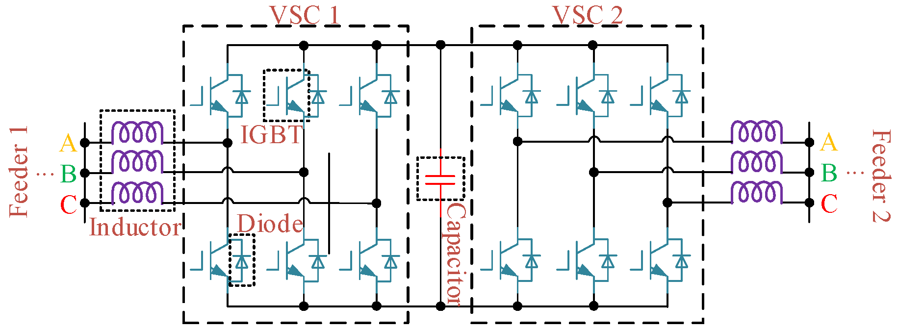 The SOP primarily relies on fully controllable power electronic devices to achieve its functionality. This section illustrates the SOP using a back-to-back voltage source converter (VSC) configuration as an example. As shown in Figure 2, the back-to-back voltage source converter SOP consists of two converters connected via a DC capacitor. Owing to the presence of a DC isolation stage, the SOP functions as an electrically open node within the distribution network.