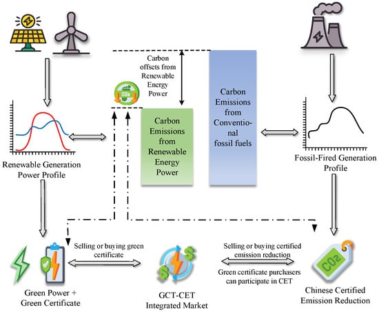 This mechanism outlines an integrated market framework combining green power, green certificates, and carbon trading. Its core process involves renewable energy and fossil fuel power generation data being reported separately to respective market platforms and renewable energy generating green certificates based on its output, while fossil fuel generation produces corresponding carbon emissions. Within the GCT-CET integrated market, renewable electricity can be traded bundled with green certificates. When electricity purchasers acquire this “green power + certificate” bundle, the associated carbon reduction benefits can offset their own generation-related emissions. This effectively bridges the physical energy market with the virtual credit market, achieving carbon reduction targets.
