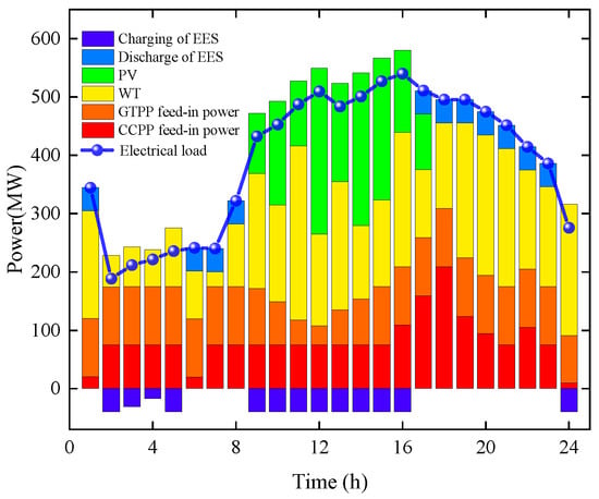 During the 12:00–16:00 period, electricity demand remains consistently high. Abundant renewable energy sources take priority in meeting primary load requirements, while CCPP and GTPP capacity approaches saturation during this period. The EES struggles to fully absorb surplus electricity. CCS units and P2G equipment leverage their adjustable energy consumption characteristics to effectively mitigate the temporal mismatch between RES generation and electricity demand, achieving superior peak-shaving and valley-filling effects.