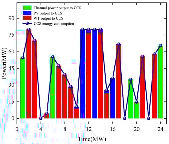 During cooperative operation, in accordance with the alliance’s resource allocation principles, the energy consumption of CCS must be jointly supplied by thermal power units and the RES, specifically wind power and photovoltaic power, the energy consumption of CCS is expressed as