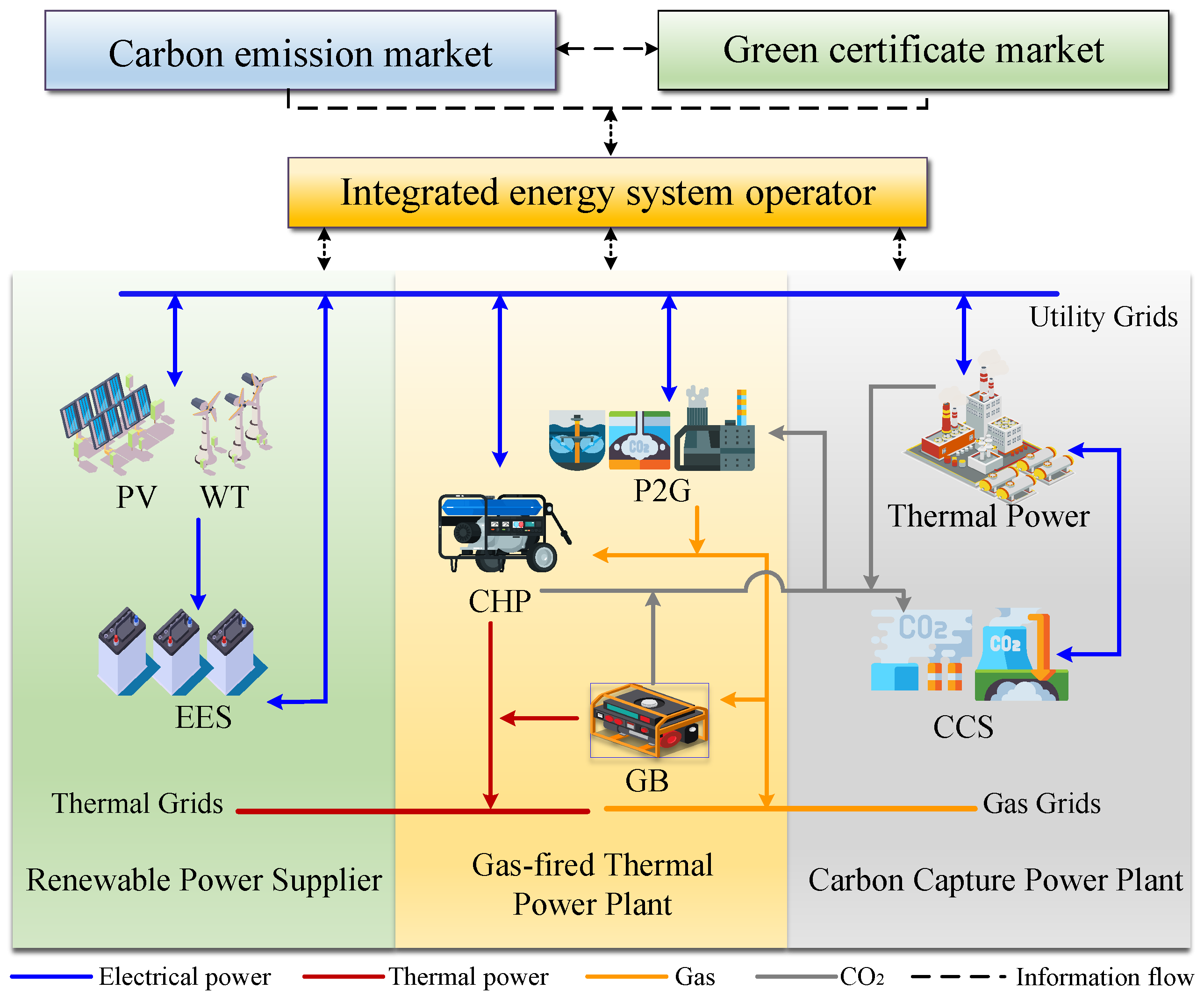 26] examined the impact of coalition strategies among stakeholders on the effectiveness of participating in the CET and GCT markets under different game frameworks, as well as the potential for low-carbon economic operations in IES under various game strategies. However, the aforementioned literature primarily focuses on economic and information interactions between the market level and multi-level energy systems. The unit models constructed for electricity, gas, and heat within IES are relatively simplistic, making it difficult to reflect the energy coupling relationships and energy flows among various entities within the system. Consequently, the exploration of IES carbon reduction potential remains insufficiently in-depth.