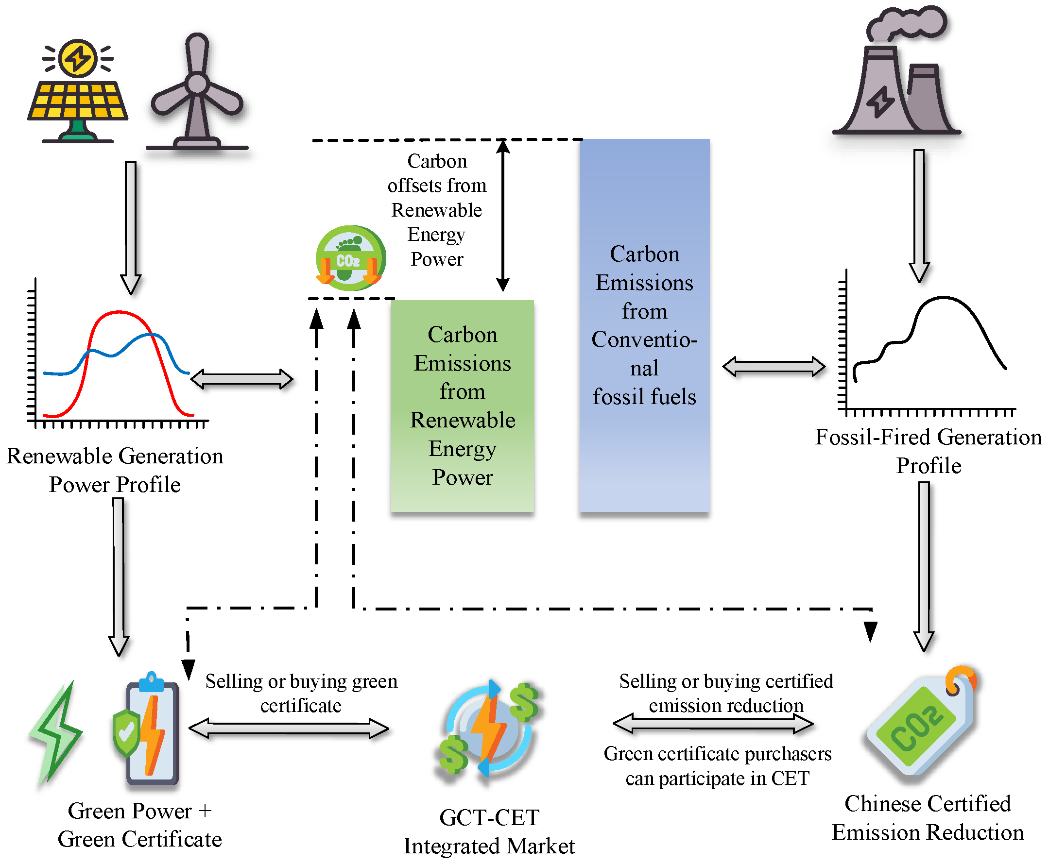 Market-based mechanisms represent a significant institutional innovation for carbon emission reduction and renewable energy integration. Carbon emissions trading (CET) commoditizes environmental rights, constraining actual carbon emissions through quota allocation and the resulting carbon price [