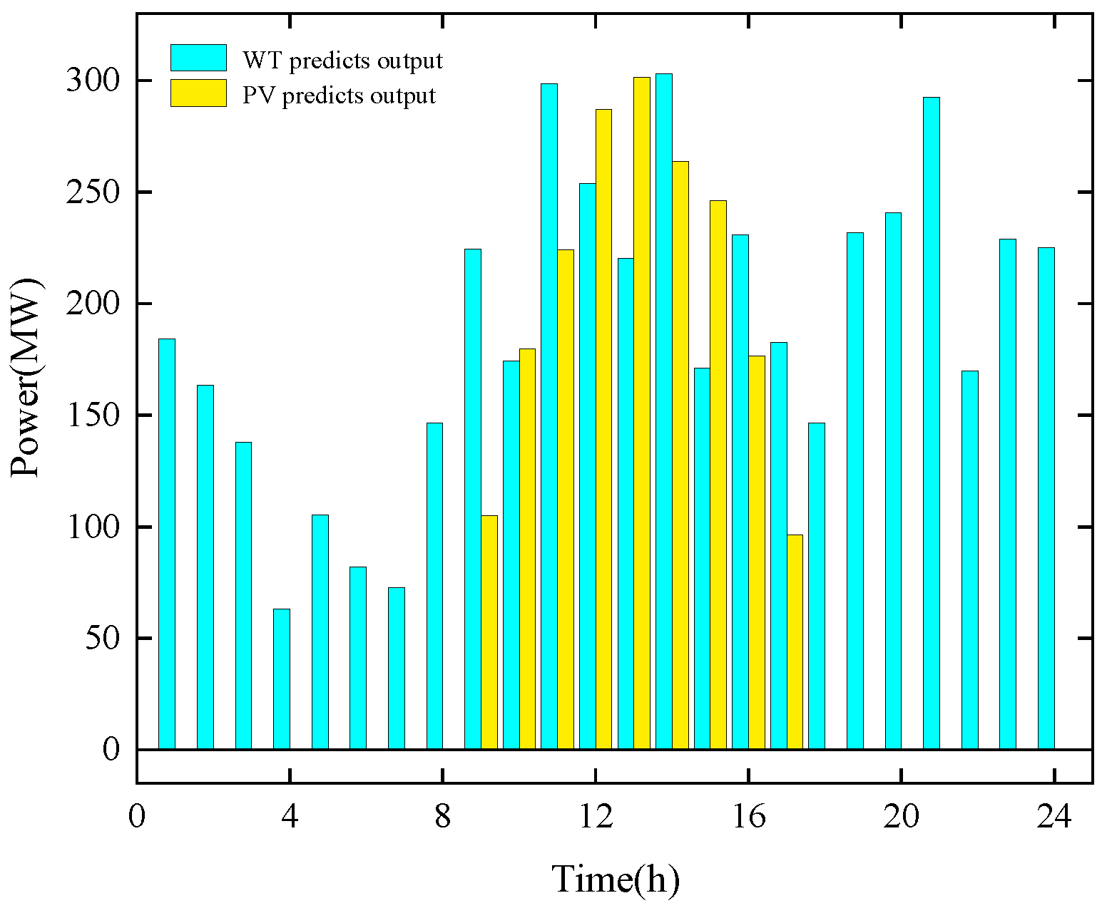 The solar and wind power forecast data and real-time electricity and heat load for this system are shown in