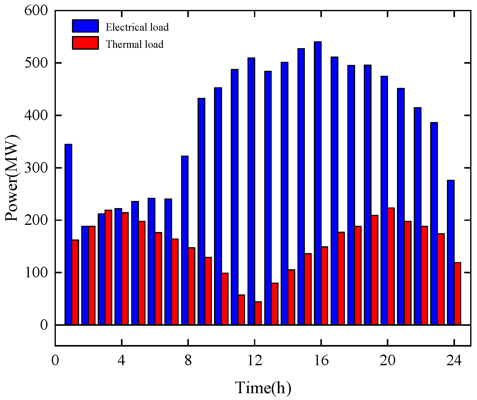 Figure 8. During the period from 01:00 to 08:00, the system’s electrical load demand was low, and renewable energy generation was relatively limited. Meanwhile, the thermal load demand remained relatively high. Due to electrical output constraints, the CHP unit reached its heating capacity limit. Therefore, the GB unit was activated to supply additional thermal energy, helping to meet the demand and alleviate supply pressure.
