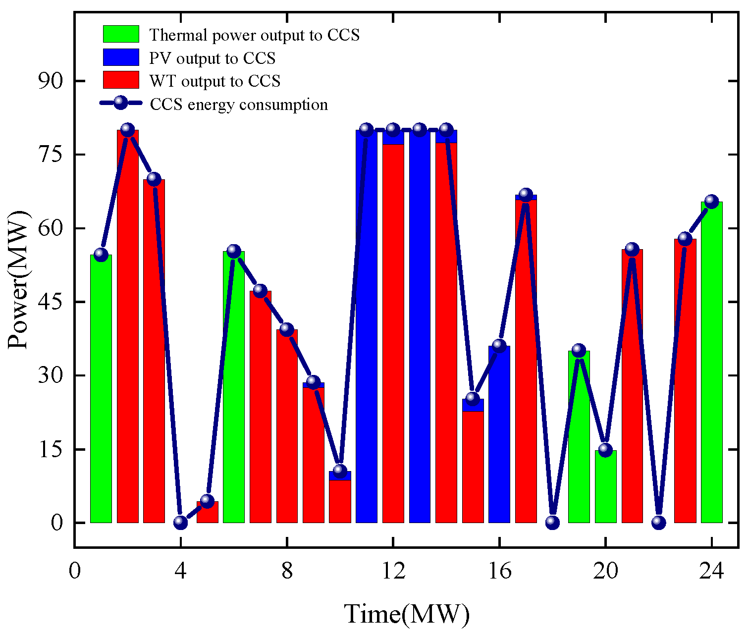 During the 8:00 p.m. to 12:00 a.m. period, the system’s total load demand shows a significant decline, with renewable energy output following this trend. At this time, the small surplus electricity within the system is supplied to the CCS to reduce carbon emissions.