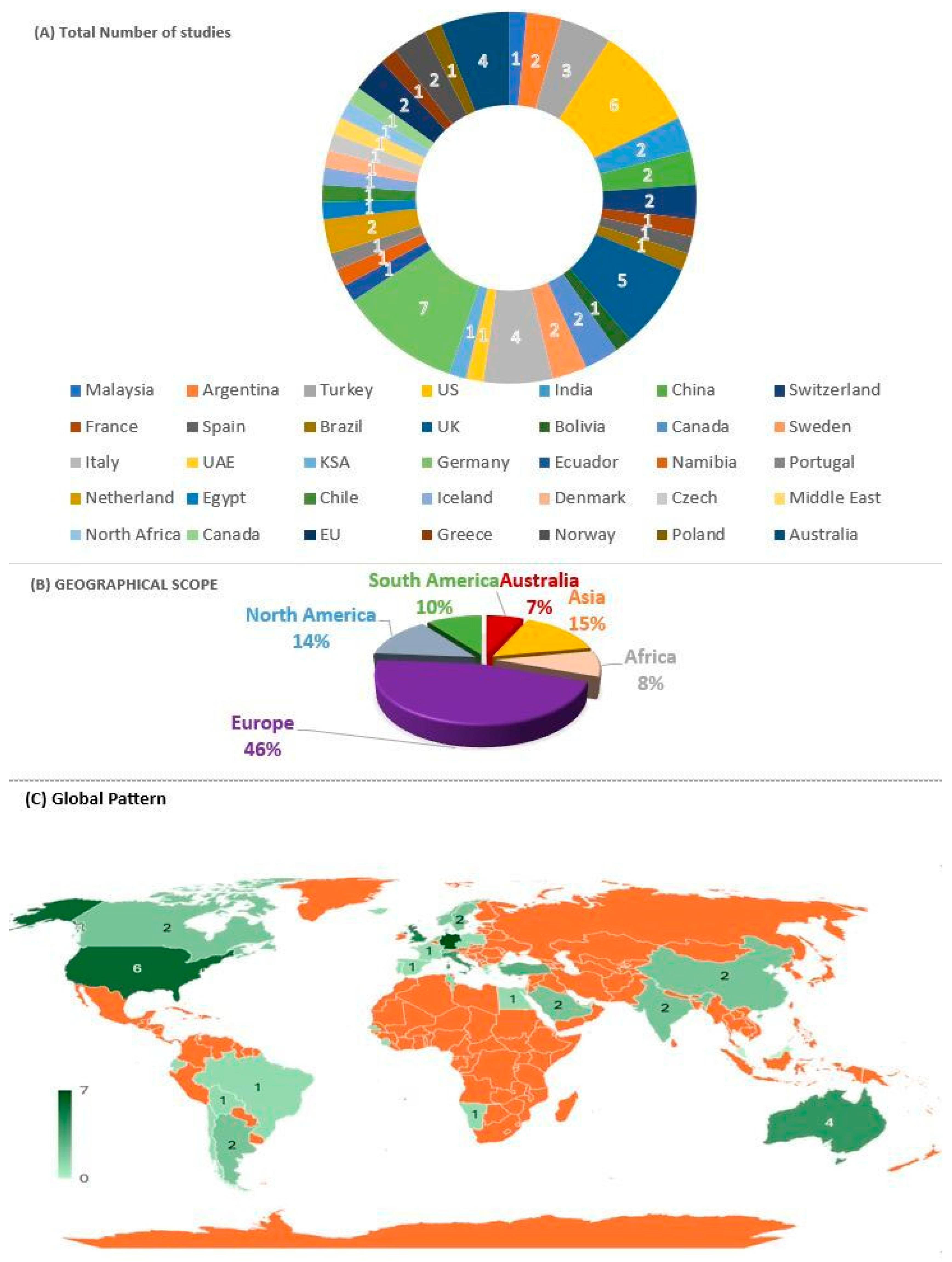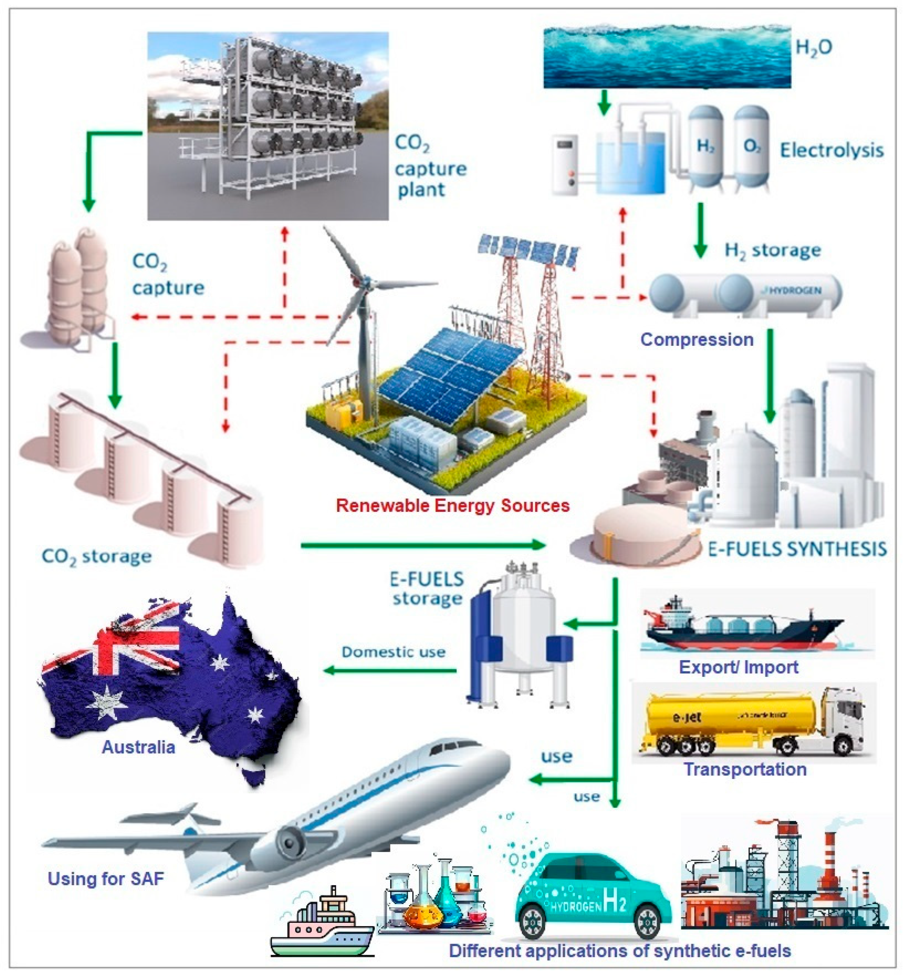 | KSA, 2023 [137] | Syn E-Fuel: CCU, CCS, Electrolysis. | TEA: CAPEX, OPEX, LCOe and MFSP | e-gasoline: MFSP of 3.24 USD/L; e-diesel: 2.89 USD/L for with solar. | LCOe from 379 to 564 USD/MWh | E-fuels can become a carbon-neutral option with CO2 taxation. | Need economic implications for decarbonizing road. |