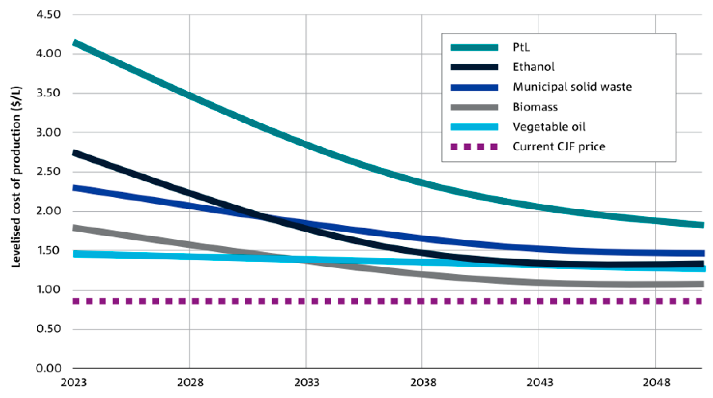 | Poland, CZ, 2024 [39] | PtL: AtJ, FT | TEA: economic viability. LCA: carbon emissions. | SAFs can reduce carbon emissions by up to 80%. | SAF is currently more expensive than CJF. | Substantial energy required for AtJ fuel. | Energy density limitations of fuels. |