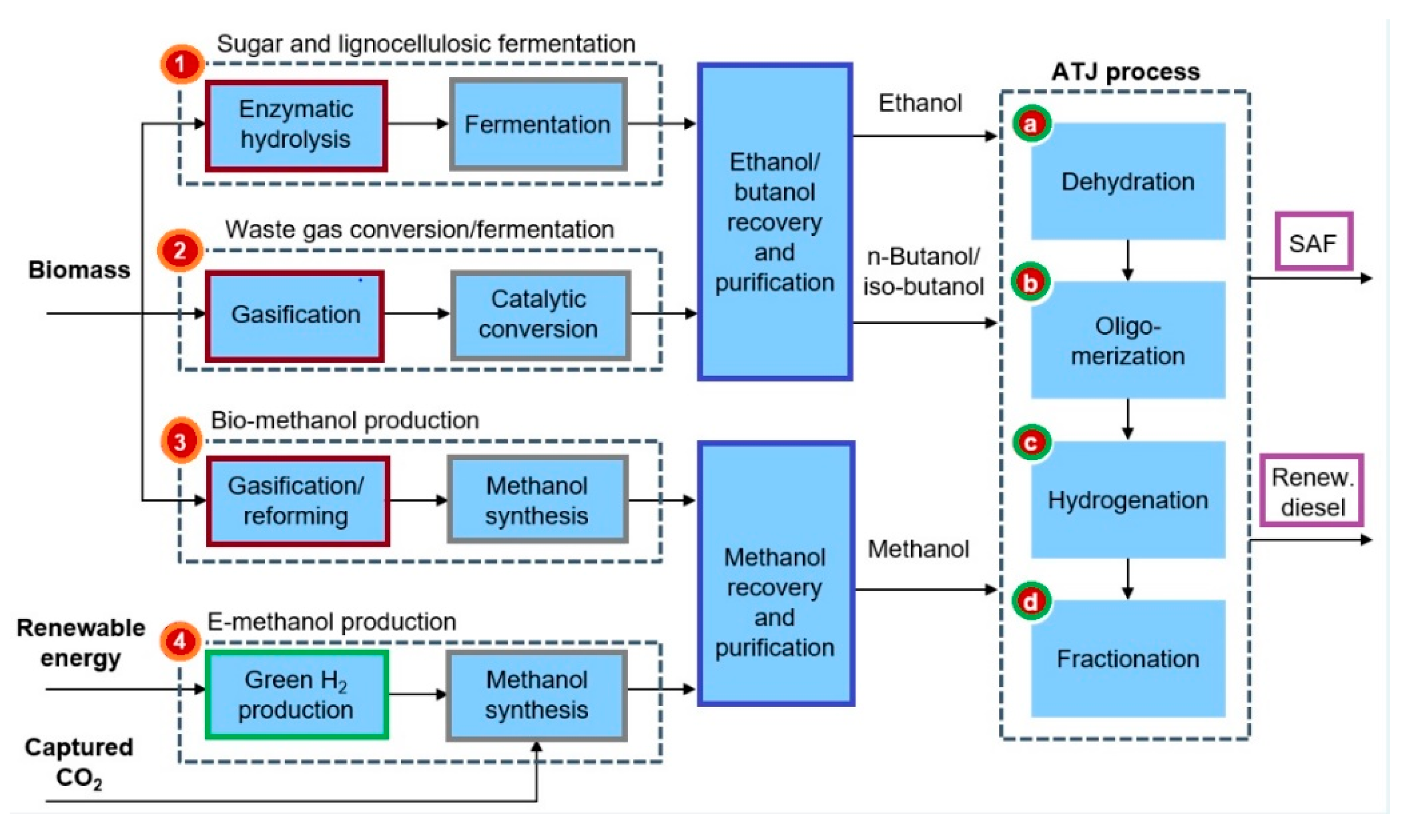 | Australia, 2024 [123] | SAF: Three-step AtJet pathway, FT. | TEA: Economic analysis LCA: Carbon intensity | 84.6% renewable power needed for comparable emissions reduction. | levelized cost of supply is 14%–25% lower than AtJ of the FT process. | Three-step AtJ pathway yields 1.6 times more SAF. | Higher capital cost for syngas fermentation. |