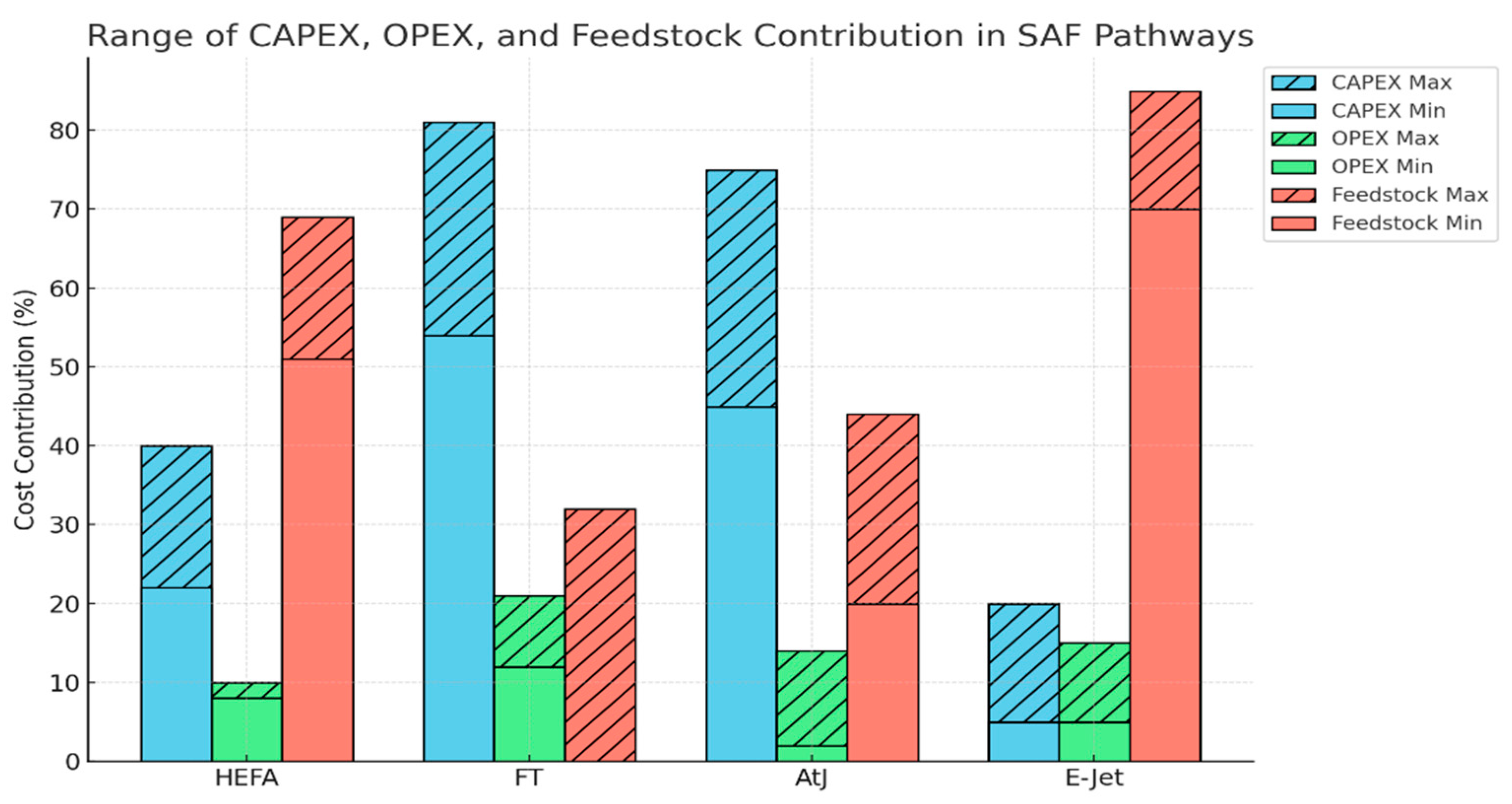 | India, 2024 [125] | SAF: PtL, FT. | LCA: environmental and costing feasibility. | SAF reduce environmental facts with renewable energy. | SAF are more costly than fossil kerosene. | Production process is energy intensive. | Need for more cost-effective SAF. |
