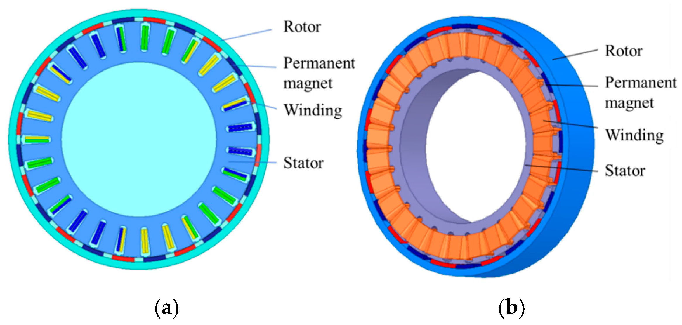 11]. For high-speed permanent magnet synchronous motors with forced air cooling, the air friction loss and electromagnetic loss were analyzed, and a coupled electromagnetic–thermal model was developed using finite element and thermal network methods [
